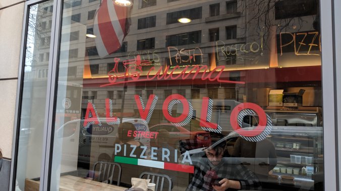 After the tour it was off to pick up the stroller and backpack, and go meet up with Zach, Eli, and Vivian. Still raining. Hard. They were waiting for us a few blocks away at a pizza place. Great time for lunch.