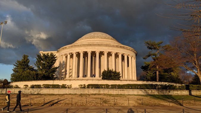 The walk from the GWU campus down to the Jefferson Memorial was a healthy one. We made it there just before dusk. The wind and the cold made it a fairly miserable walk. But once we got there it was worth it. Just an amazing monument. Much larger than it looks from a distance.