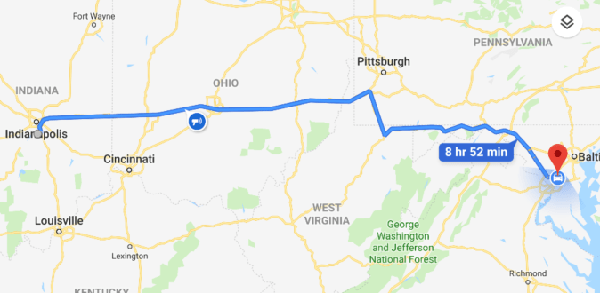 Up and at ’em! The plan today was to leave at 7am and to expect about 12 hours on the road. Driving time was approximately 9 hours or so and we expected to make several stops along the way. All in all it was a pretty easy drive. I-70E out of Indianapolis, through Ohio and into Wheeling WV, into Pennsylvania just south of Pittsburg. I-79S into Maryland to I-68 and I-70 into the DC area.
