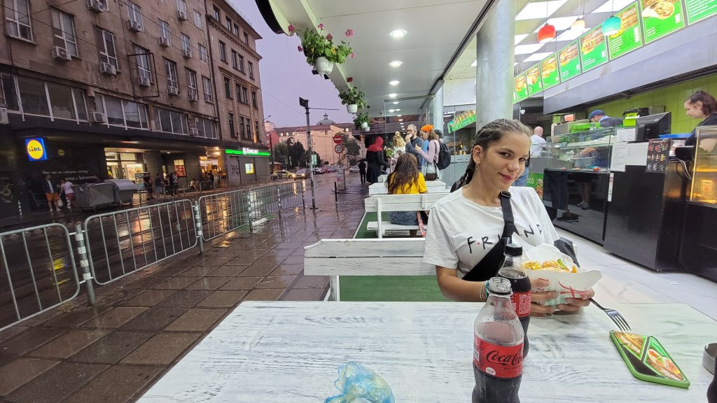 We headed out for dinner at about 8:00 or so that evening. Our small packed lunch in the mountains burned off a while ago and we were pretty hungry. My suggestion was to return to the BBQ place we’d eaten at for lunch the day we went the see the Cathedral and the girls went along. I got the “chicken duner” that I wanted, but the girls decided they wanted something else. So it was off in the direction of Vitosha Blvd. to see what looked good. We almost made it when they spotted something interesting. Sonya got a hot dog loaded with fries and Meagan got a wrap of sorts. When we all sat down it started raining pretty hard so we sat and ate in the cool air waiting for it to stop raining.