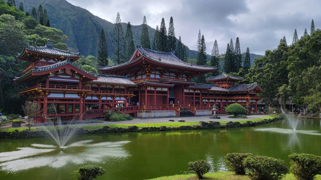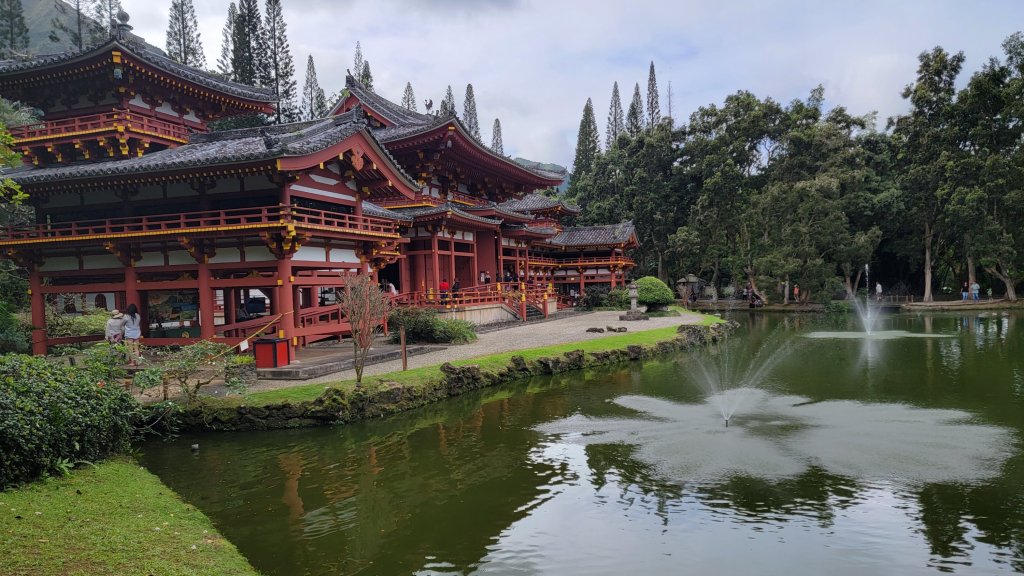 One of the tourist attractions that was not closed today was the Buddhist Byodo-In Temple near Kaneohe on the windward side of the island, so we thought we’d go check it out. It’s a replica temple of the Byodo-In Temple in Uji, Japan, built in the mid-60s and opened in 1968. It was built to commemorate the Japanese immigrants who migrated to Hawaii in the 1850s / 1860s. It’s a beautiful structure. And the surrounding cemetery illustrates how important it is to many Japanese.