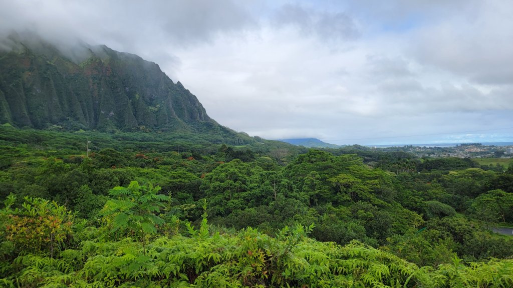 Last full day in Hawaii today! Not too many solid plans today. Sonya was recommended that we see the Ho’omaluhia Botanical Gardens near Kaneohe. So that’s where we’re started today. If I read correctly, it was an Army Corps of Engineers project to prevent erosion from rapidly running rainwater. It highlights several tropical plants. Not being a botanist, I can’t speak with any authority on the subject. I can just say that it was pretty. We experienced a little rain in that area. No doubt the tropical rains on that part of the island contribute to the beautiful plant life.
