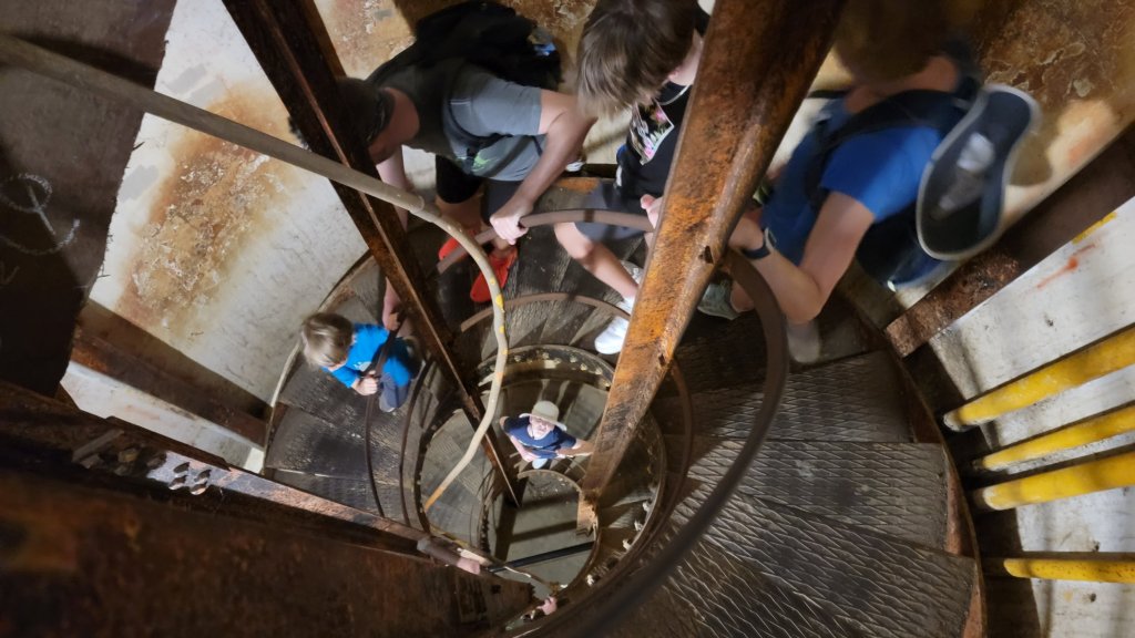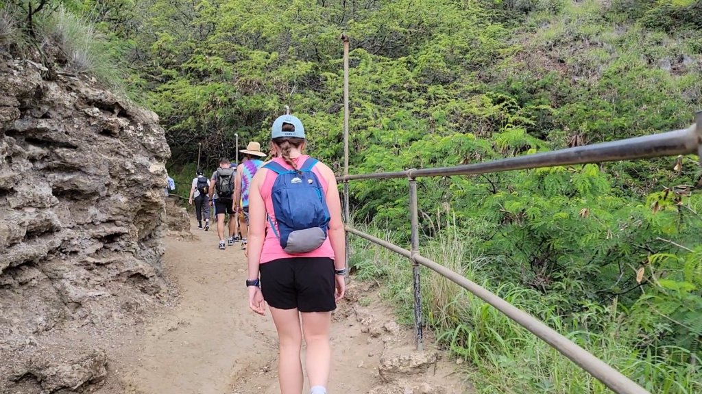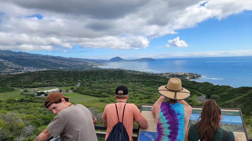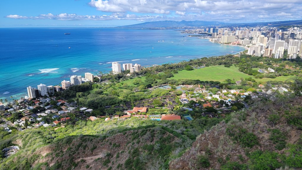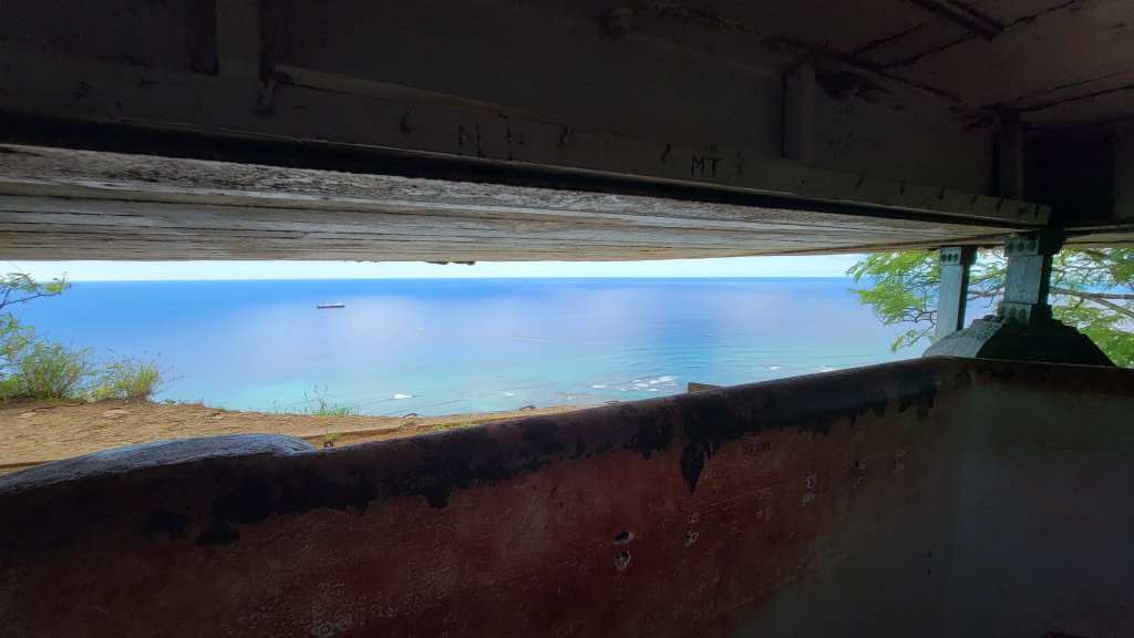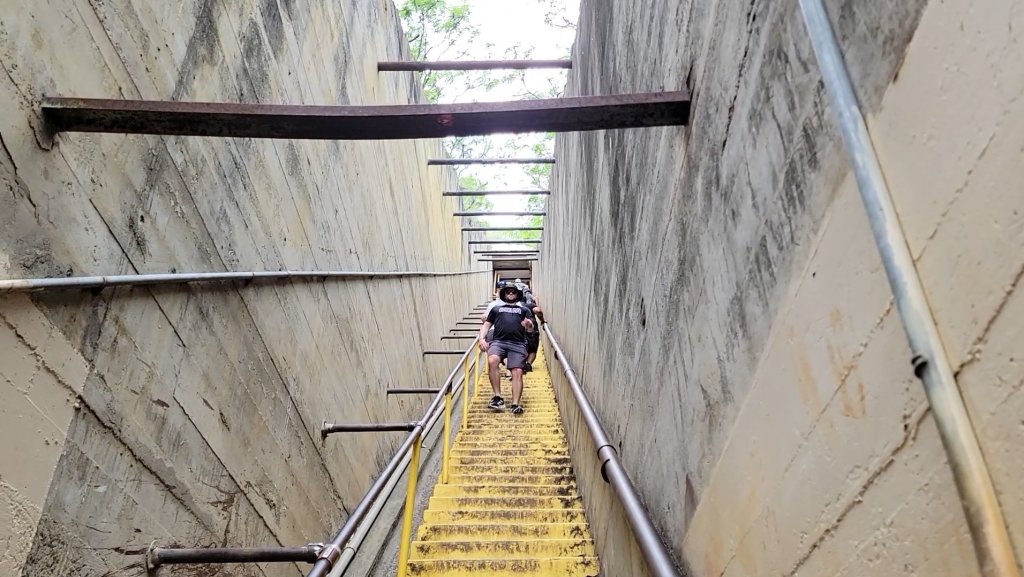 Today was the Diamondhead hike! I’d been simultaneously excited about and dreading this hike. If you’ve ever done it, you know what I mean. The hike is up the inside of the basin wall of the volcano known as Lē’ahi to the Hawaiians. The crest of the hike has a number of pillbox structures, which I believe were used as lookouts and the island’s defense during WW2. To reach this pentacle, it’s literally an uphill climb, starting on a sidewalk, then a set up switchbacks, then a series of stairs. I’m sure this isn’t an official count, but I counted 213 stairs in all. (Due to the difficulty of this hike, Sonya stayed behind with Vivian who would have never made it.) In the end, it’s very worth the effort to see the panoramic view of Honolulu, Waikiki, and the southern part of the island.