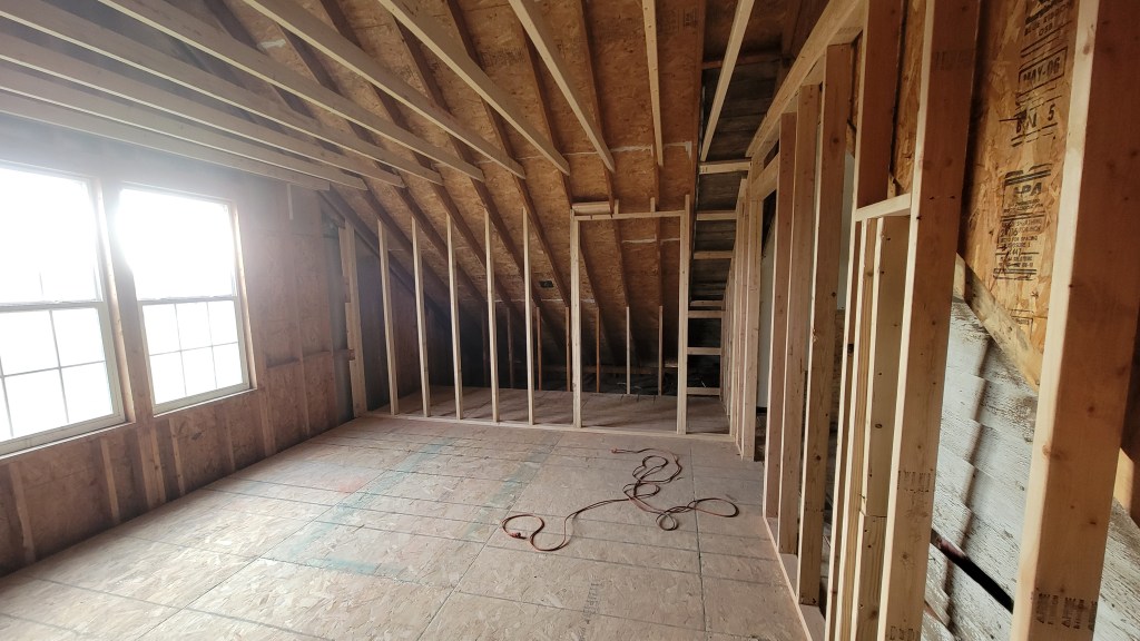 The upstairs bedroom, which started off as unfinished space on the second floor of the most recent addition to the house, was roughed in. This will be Meagan and Savannah’s room and it will be the nicest bedroom in the house! It is a 19 1/2 ft. x 13 1/2 ft. room with a walk-in closet, and a double window looking out onto the back of the property.