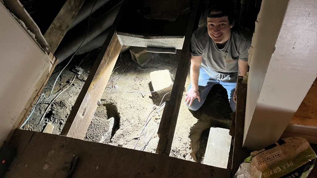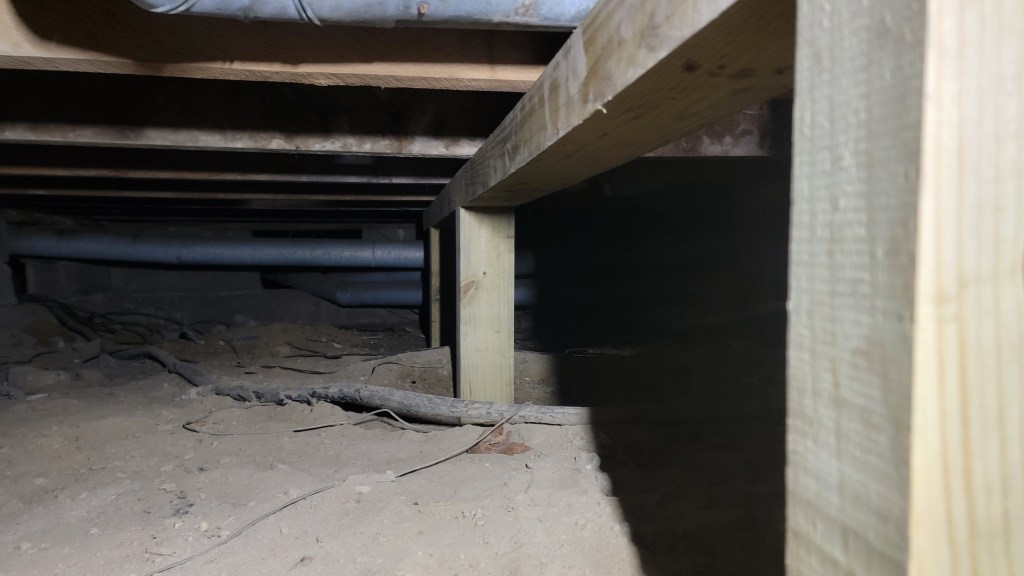 Eli had experience leveling floors from a high-school internship that he had a few years back when he renovated an older house in Indianapolis. Basically, the approach was this: use a 12 ft. long 4×6 as a header to lift the floor joists into place and permanently install the header, lifting it with 4×6 posts sitting on concrete footers. Thursday night, Eli and his friend Nick cut holes in the floor decking for easier access to the crawlspace and then started digging holes for the footers. We decided to use concrete blocks as footers instead of pouring concrete into the holes like some do. When digging, they very quickly reached hard ground in probably 12″ or less. Friday night, Eli dug out the 3rd hole and then he and I maneuvered the 12 ft. long 4×6 down into the crawlspace, which was no easy task; we ended up going through the 1st floor bathroom floor which had recently been removed by the contractors. We borrowed a couple of bottle jacks from a friend, putting those at the ends of the header to bring it up to the house, and then started off using a 3 ton car jack to bring up the middle of the header. The car jack ended up being very difficult to work with in the crawl space, so we went and bought a 3rd bottle jack, which worked just fine. There were some difficulties along the way, but we were eventually able to get the header fairly flat (flat enough to make a 90+% improvement, which was good enough for us).