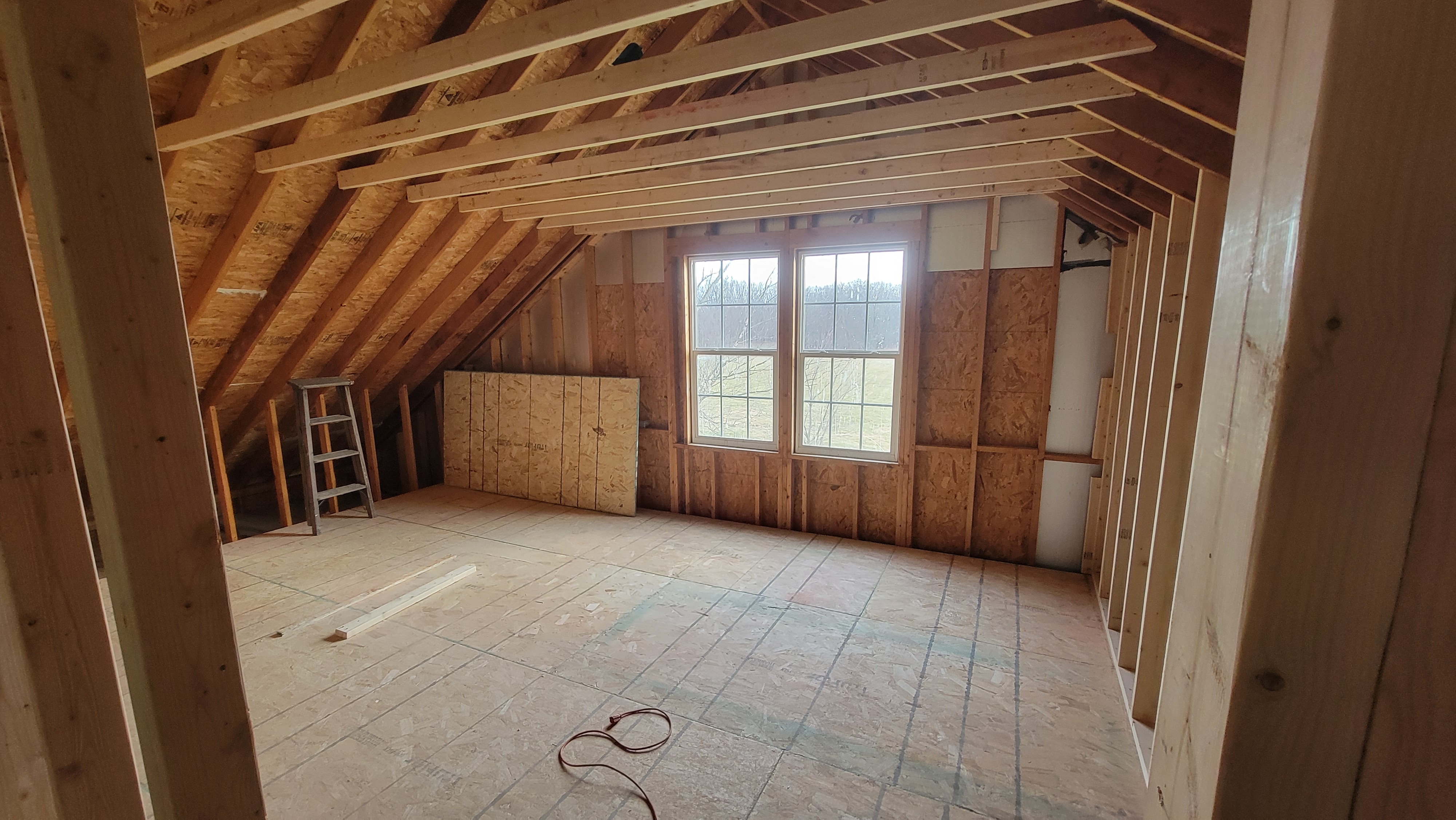 The upstairs bedroom, which started off as unfinished space on the second floor of the most recent addition to the house, was roughed in. This will be Meagan and Savannah’s room and it will be the nicest bedroom in the house! It is a 19 1/2 ft. x 13 1/2 ft. room with a walk-in closet, and a double window looking out onto the back of the property.