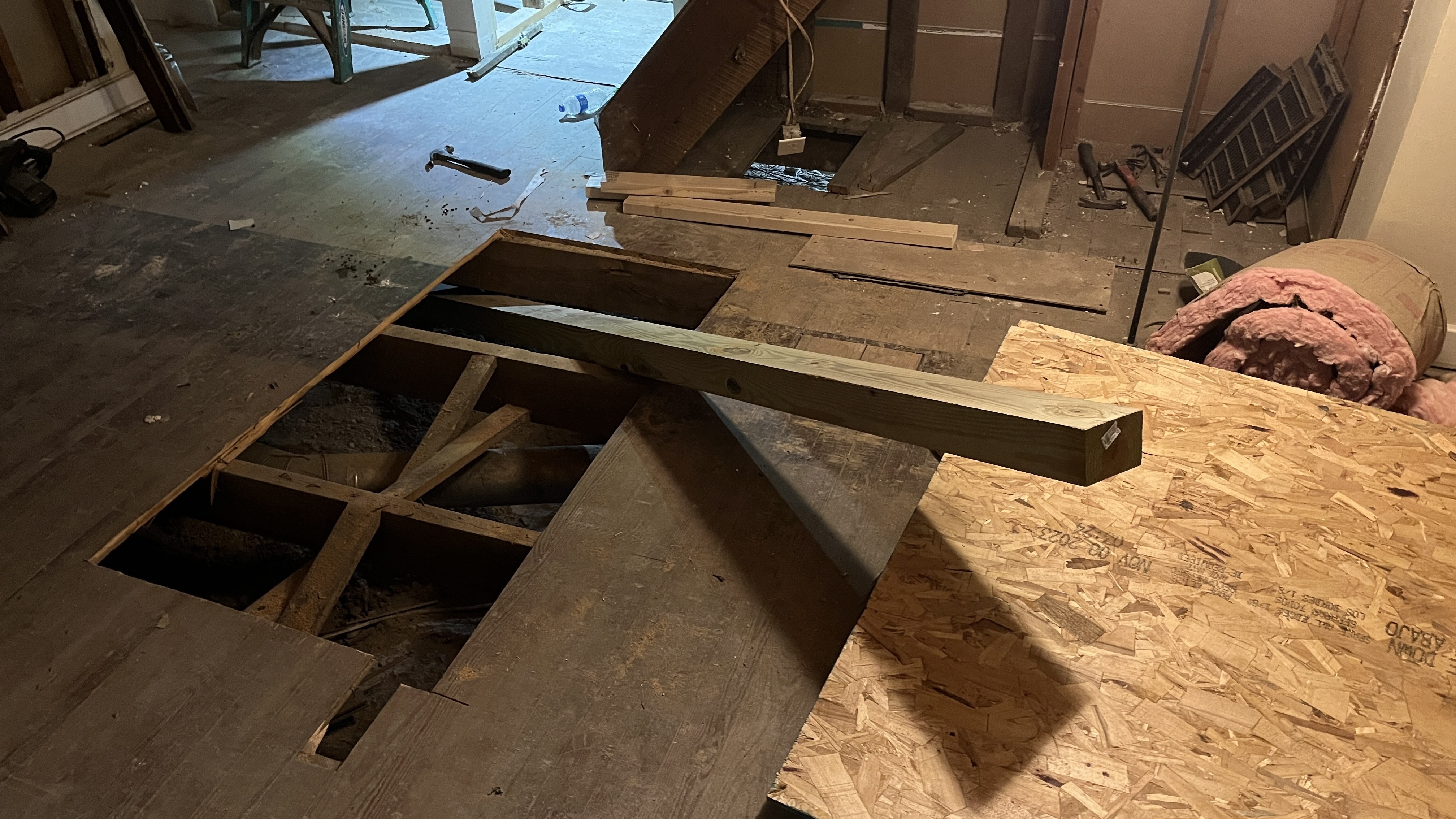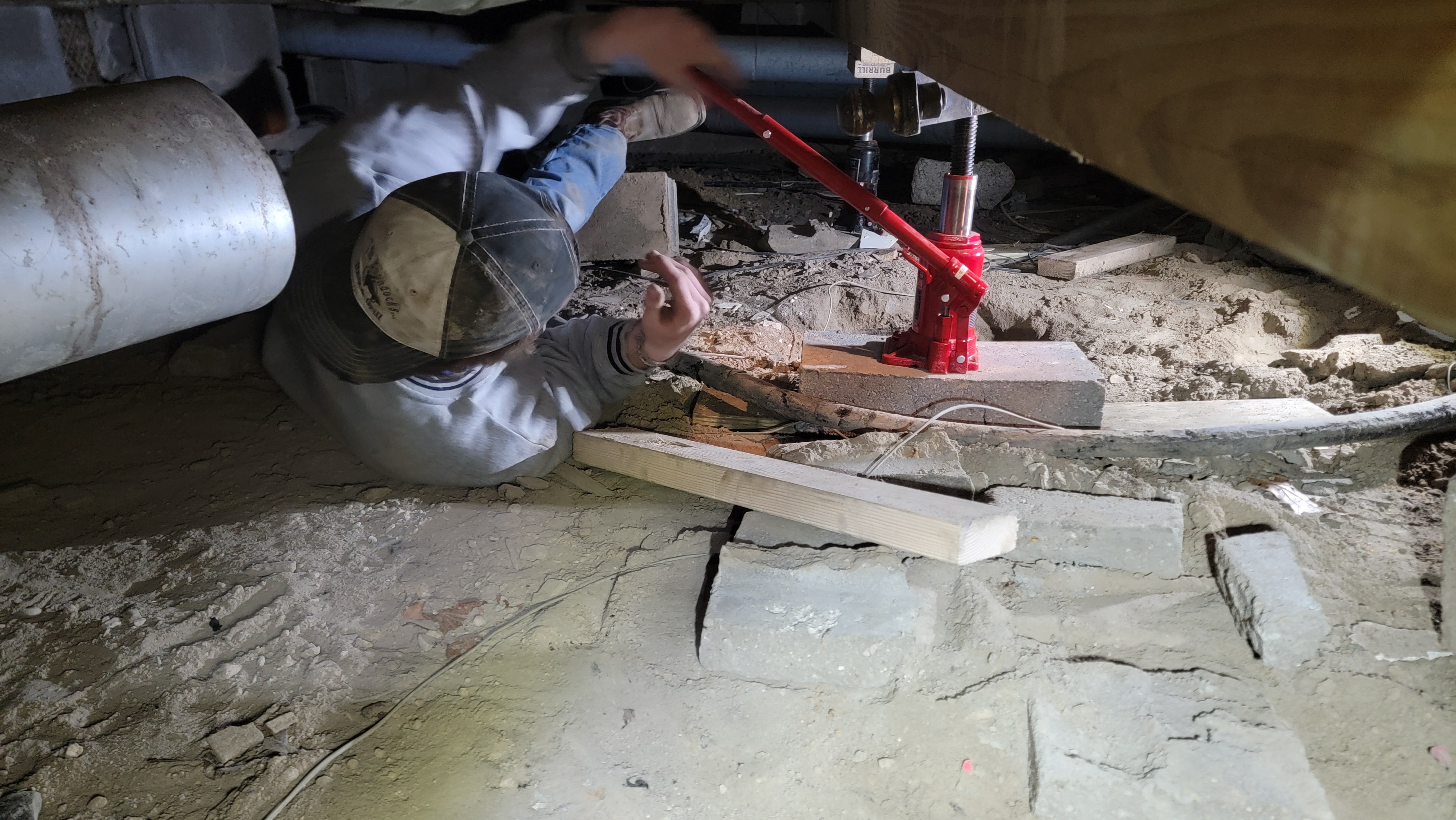 Eli had experience leveling floors from a high-school internship that he had a few years back when he renovated an older house in Indianapolis. Basically, the approach was this: use a 12 ft. long 4×6 as a header to lift the floor joists into place and permanently install the header, lifting it with 4×6 posts sitting on concrete footers. Thursday night, Eli and his friend Nick cut holes in the floor decking for easier access to the crawlspace and then started digging holes for the footers. We decided to use concrete blocks as footers instead of pouring concrete into the holes like some do. When digging, they very quickly reached hard ground in probably 12″ or less. Friday night, Eli dug out the 3rd hole and then he and I maneuvered the 12 ft. long 4×6 down into the crawlspace, which was no easy task; we ended up going through the 1st floor bathroom floor which had recently been removed by the contractors. We borrowed a couple of bottle jacks from a friend, putting those at the ends of the header to bring it up to the house, and then started off using a 3 ton car jack to bring up the middle of the header. The car jack ended up being very difficult to work with in the crawl space, so we went and bought a 3rd bottle jack, which worked just fine. There were some difficulties along the way, but we were eventually able to get the header fairly flat (flat enough to make a 90+% improvement, which was good enough for us).