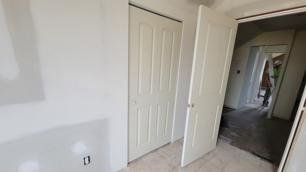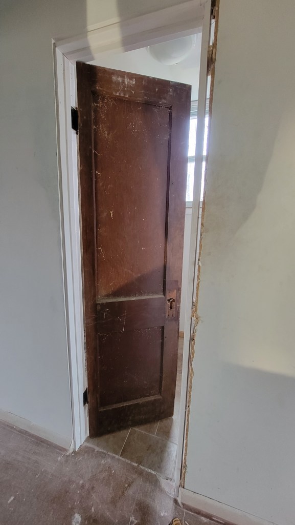 The crew did get some more doors upstairs. For the bathroom door, we bought a 24″ wide door from the salvage store in hopes that it could be trimmed down some to fit the 24″ W opening. That’s exactly what Will did, and it looks great! For the girls’ room, we decided to go easy, at least for now, and buy their entryway and closet doors from a box store. We still have Seth’s room to install a door for, and that will be on us. Wish me luck on that first-time project.
