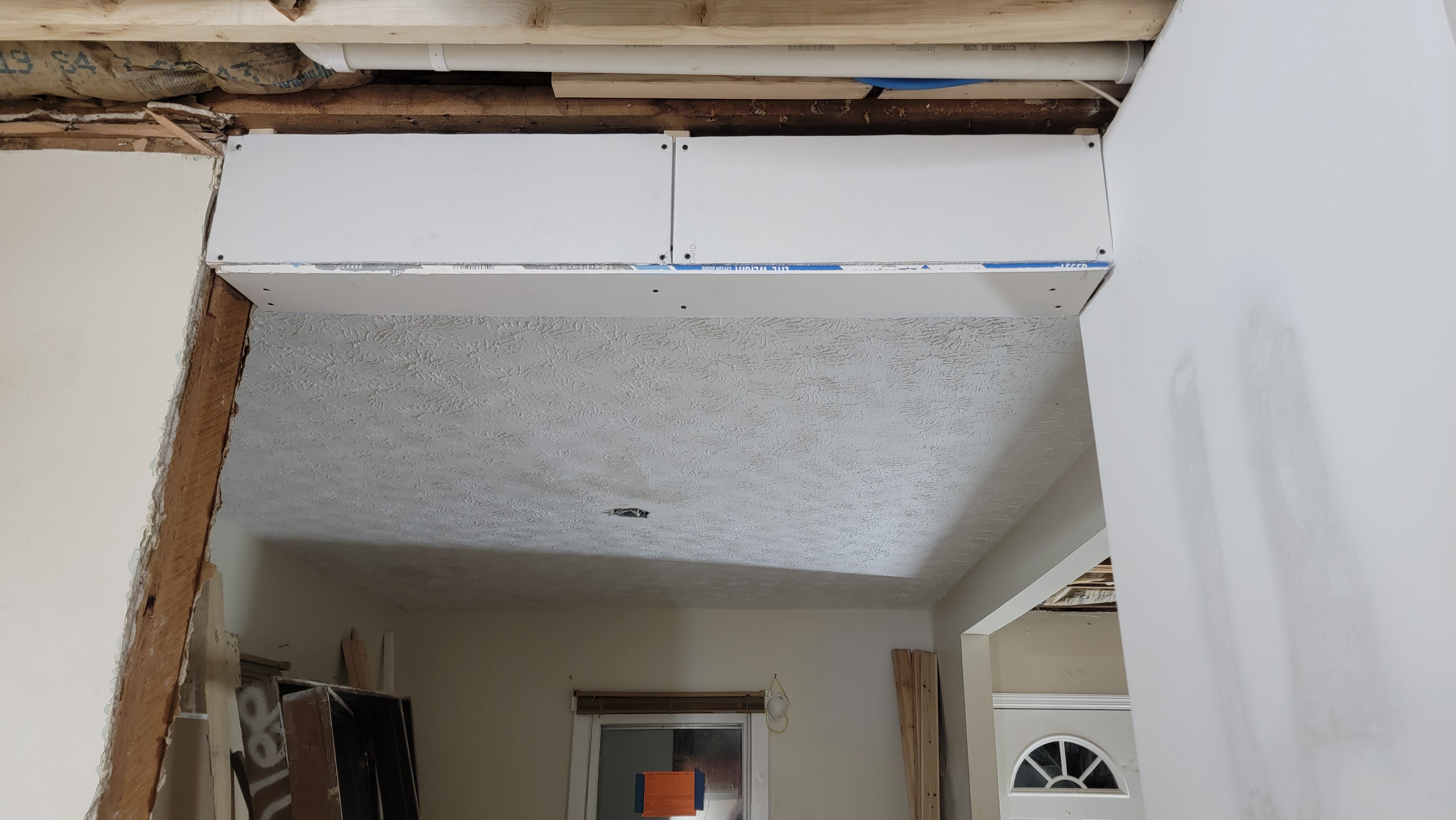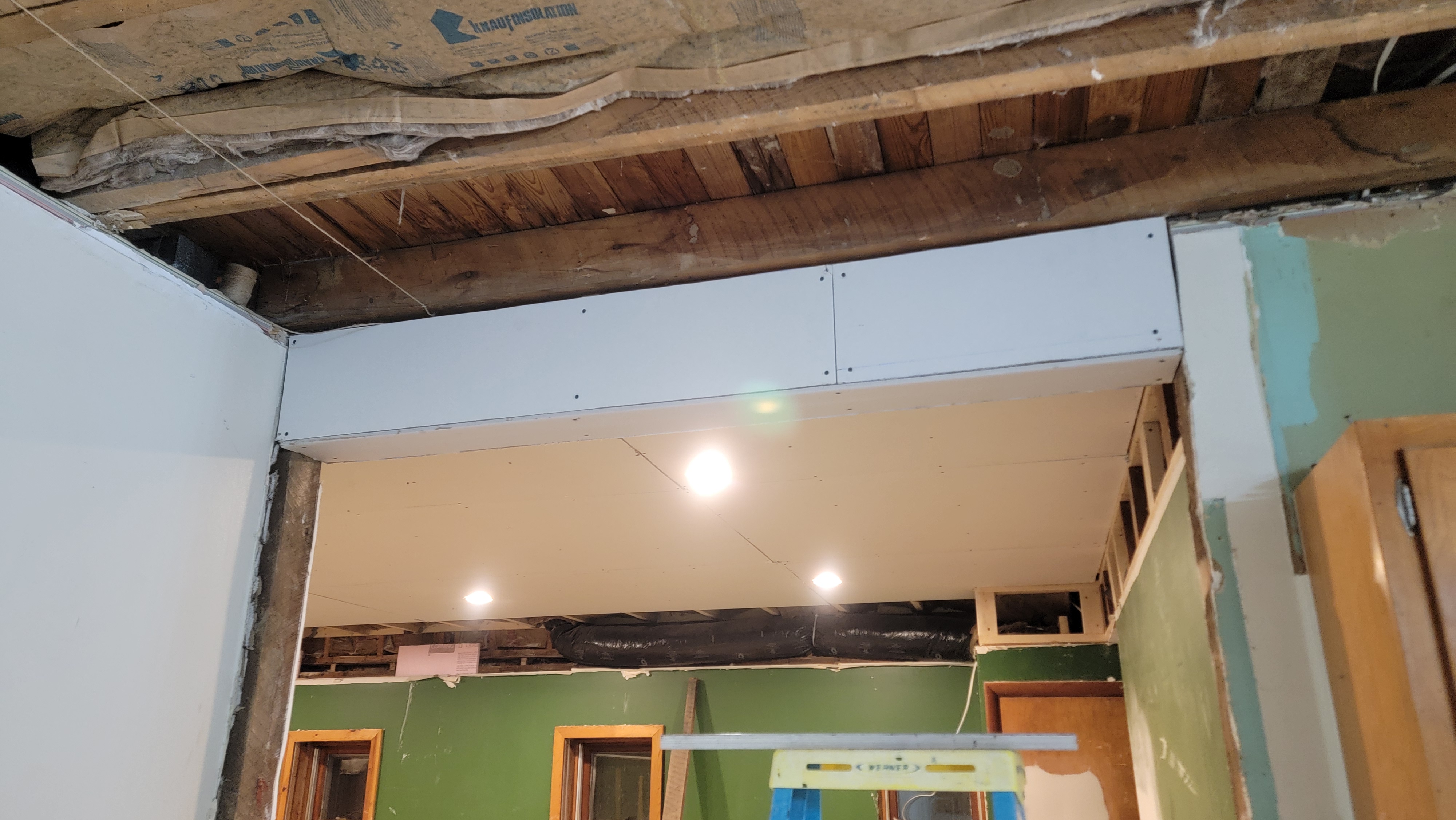 Friday evening and Saturday were times for us to get some things done. Eli and I had installed headers over the entries from the kitchen to the dining room and family room. Friday night, I spent a little time putting up drywall on the headers. A drywaller, I am not. But it was good practice, at least. Hopefully, whoever ends up finishing it won’t be too upset with me. It was all in preparation to install the ceiling of the kitchen.