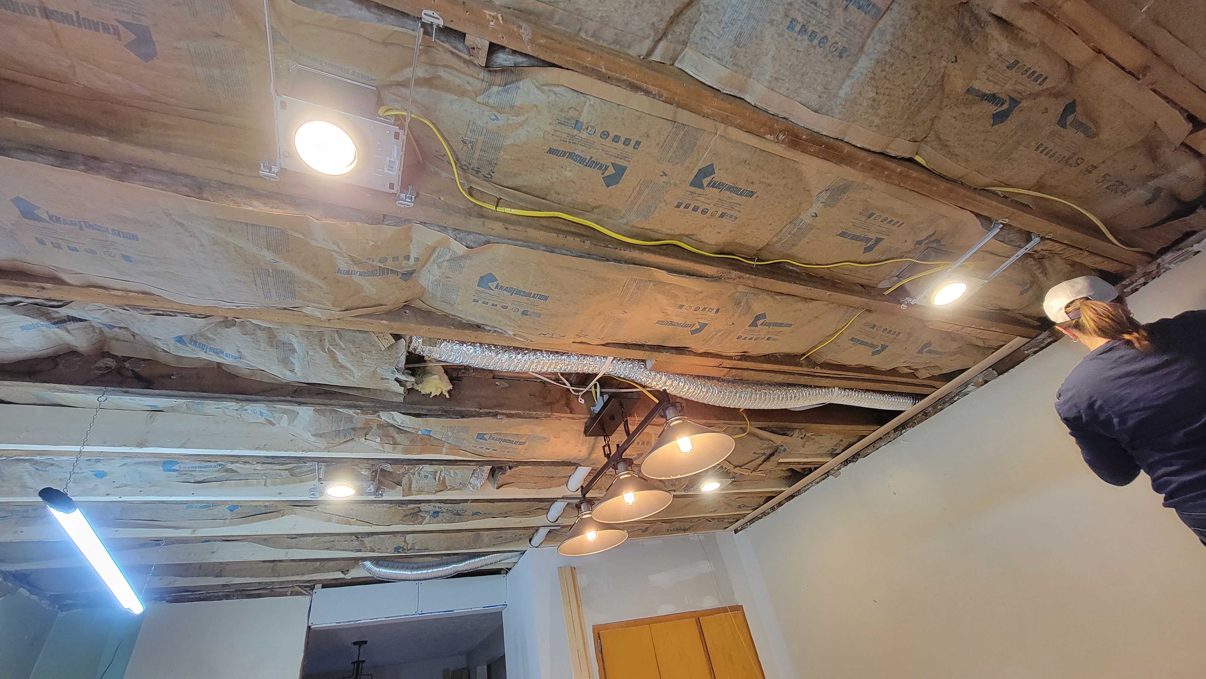 Second, just out of curiosity, we hung some lights to get an idea of what the kitchen and dining room would look like. Something told me that the single light in the kitchen wouldn’t be enough. Turns out that I was right for the first time this year+2. Luckily, we had 4 canned lights left over from the family room, so we installed those as well, which really lit up the kitchen.