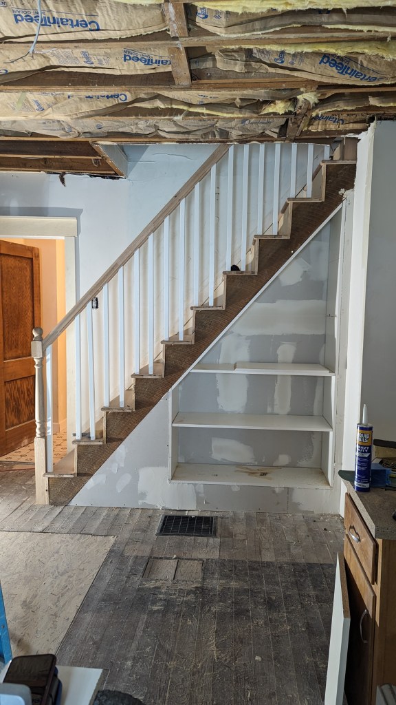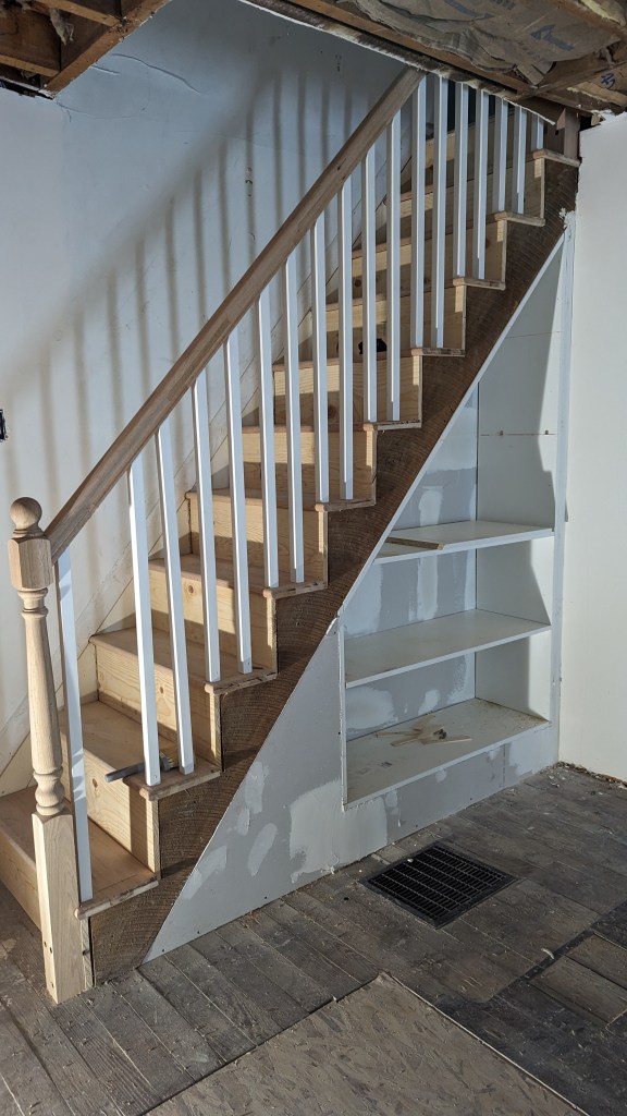 Another item that the crew finished up was the stairs and the banister. As you can see, they did a phenomenal job bringing our vision to life. Sonya had run across an idea for a small shelf set to better utilize the space under the stairs. Alex Jr. did a great job there. The pictures I took were before they were done, but you get the idea.