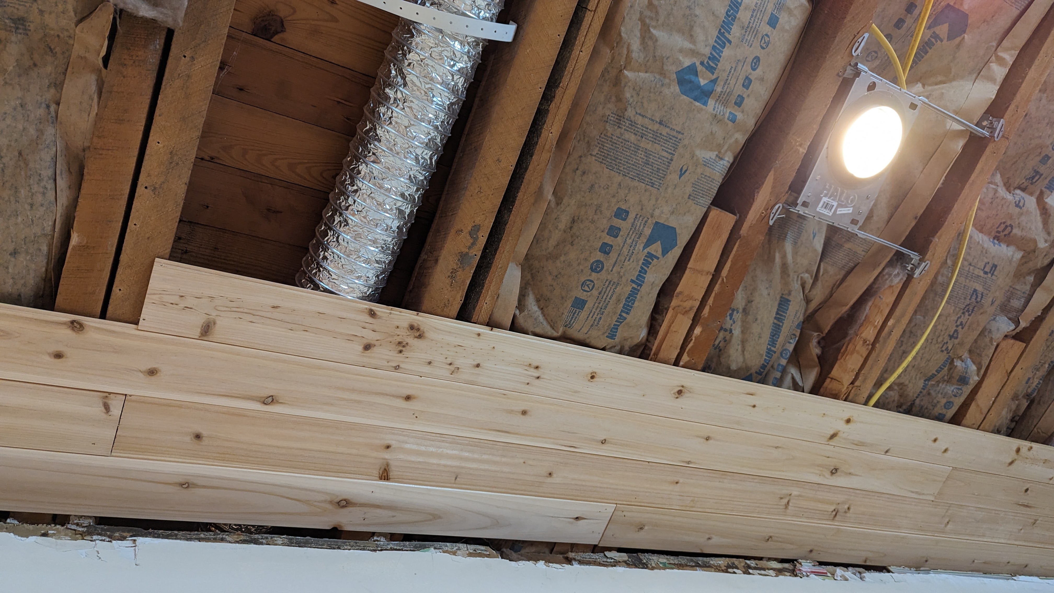 With those two items out of the way, and some additional removal of some old drywall, it was time to tackle this shiplap. Overall, it went up fairly easy. With remodeling this older house, we ran into the same issue as with the drywall installation in the family room – the joists were uneven. So we were nervous about that. Turns out that the shiplap was great for compensating for the joist height differences (which were only slight in the kitchen). Cutting the boards to length was easy. The biggest challenge was cutting holes for the canned lights. Turned out that a large Speedway Big Gulp cup lid was the perfect template. We got about a third of the ceiling completed by Saturday night.