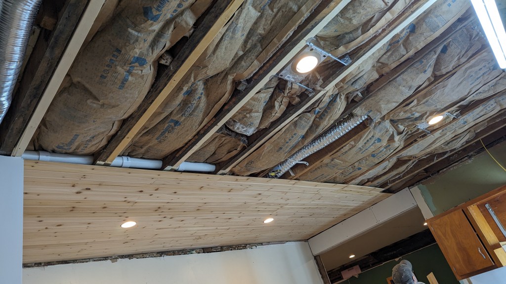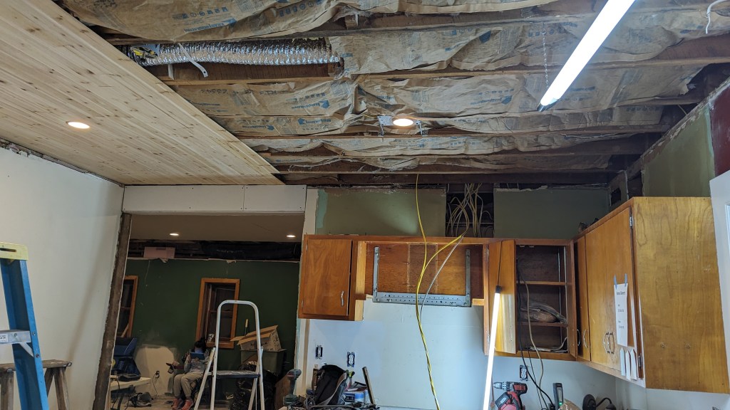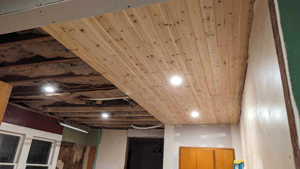 Saturday was kind of a fun day (I thought, anyway). We’ve heard that a true test of a marriage is hanging wallpaper together. We’d hung wallpaper years ago with no significant marital problems arising. Now, we were ceetainly in next-level marriage stuff. We hung drywall together last weekend, which I suppose is another one of those marriage tests. Saturday, it was installing shiplap on the ceiling of the kitchen.