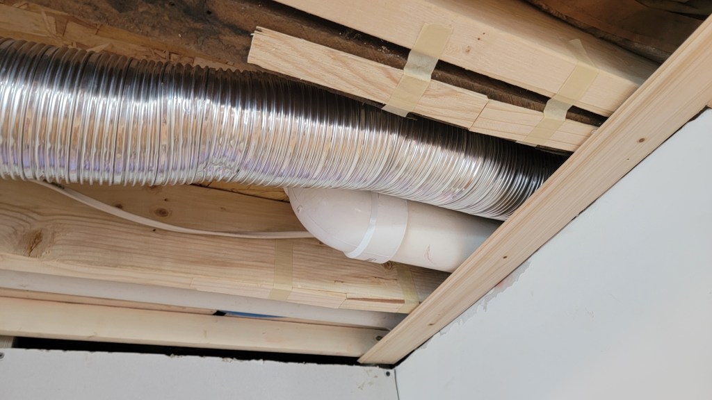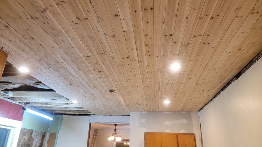 As I wrote earlier, Sonya and I had originally wanted to expose the joists in the ceiling of the kitchen, but that idea didn’t exactly pan out. So she had the idea to install shiplap onto the ceiling. At this point, we’re about 2/3 of the way done installing that and it looks really good! There were a couple of challenges. The drains from the 2nd floor bathroom come into the kitchen ceiling and hang lower than the joists at the toilet drain. The result is a small bow in the shiplap, where we had to attach some shims, that we’re hoping won’t be noticeable. Another issue was from the installation of the drains where they had to put a few metal supports on the joists where the shower drain passed through. Those supports don’t really like brad nails, so there’s a bit of a “sag” there as well. But overall it’s looking really good. We’ve even had a couple of contracted guys mention how good it looks.