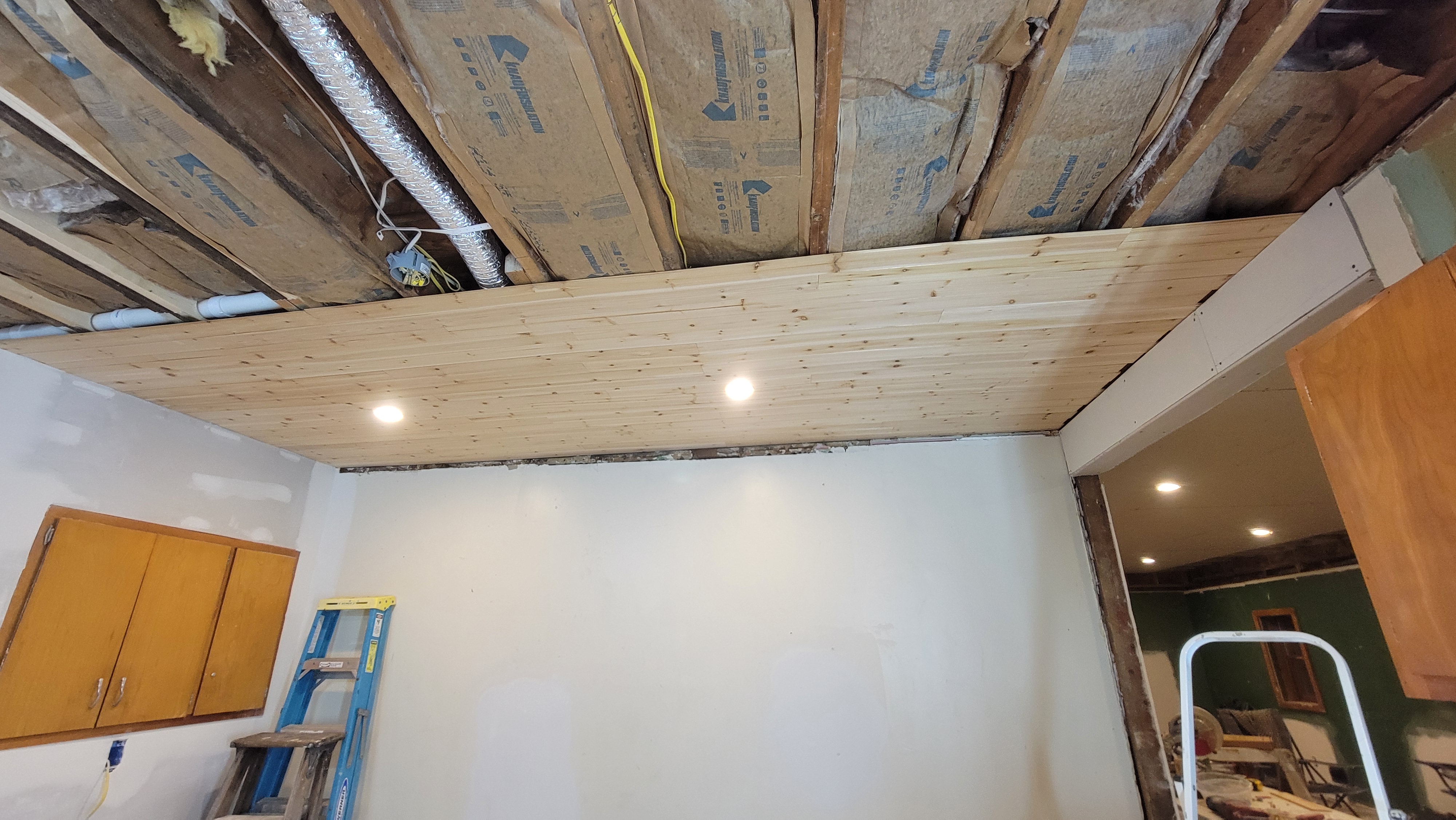As I wrote earlier, Sonya and I had originally wanted to expose the joists in the ceiling of the kitchen, but that idea didn’t exactly pan out. So she had the idea to install shiplap onto the ceiling. At this point, we’re about 2/3 of the way done installing that and it looks really good! There were a couple of challenges. The drains from the 2nd floor bathroom come into the kitchen ceiling and hang lower than the joists at the toilet drain. The result is a small bow in the shiplap, where we had to attach some shims, that we’re hoping won’t be noticeable. Another issue was from the installation of the drains where they had to put a few metal supports on the joists where the shower drain passed through. Those supports don’t really like brad nails, so there’s a bit of a “sag” there as well. But overall it’s looking really good. We’ve even had a couple of contracted guys mention how good it looks.