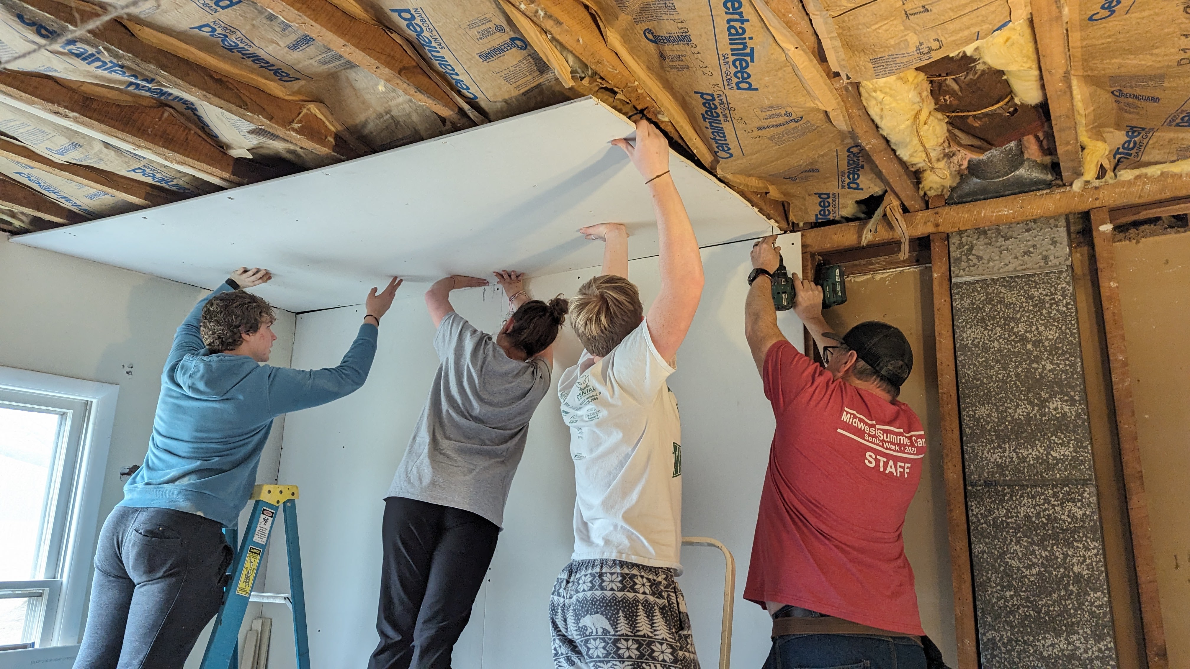 We still have some drywall to hang! Not our favorite part of the project, but necessary nonetheless. The living room still needs drywall hung on the ceiling after some evaluation of the joists, which have been sagging at different rates over the past 100 years or so. This past Saturday, we bought some 10′ 2×4’s for sistering with the existing joists to “level” the ceiling drywall as best as we can. We tackled the easier half (north end) of the ceiling by installing one 2×4. The south-end half will be more of a challenge.