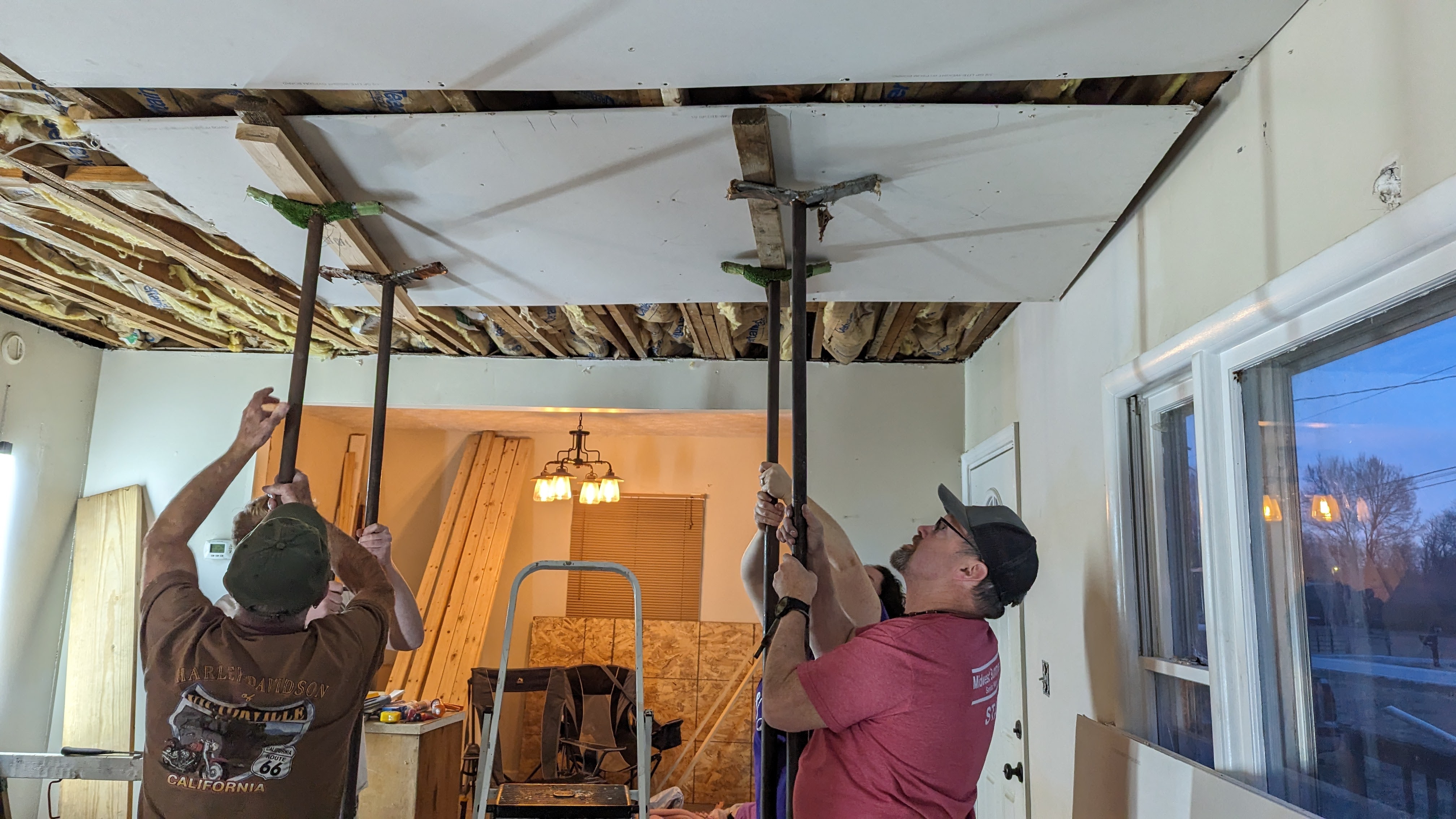 A friend of ours, Jeff, brought by some homemade drywall jacks that he’d made back in the 1980’s. He’s also used them for installing awnings in the past. They came in very handy, especially after installing a couple the “old fashioned way”. It went fairly well. One of the sheets did fall onto my head when I made the mistake of relieving the sheet holding crew before enough screws were installed. That was the most exciting part of it. Anyway, we have about 40% of the living room ceiling installed. More drywall fun this week no doubt.