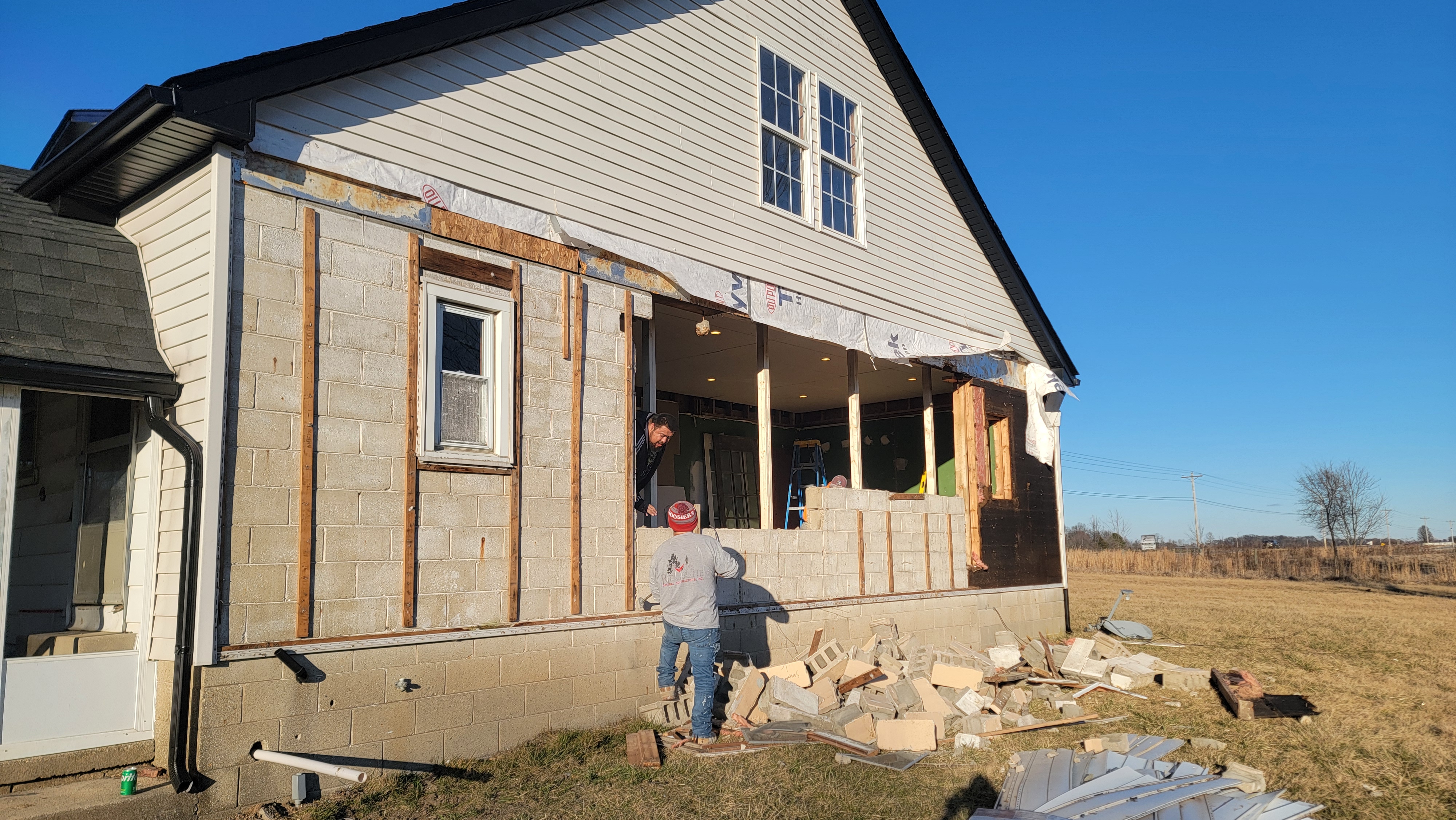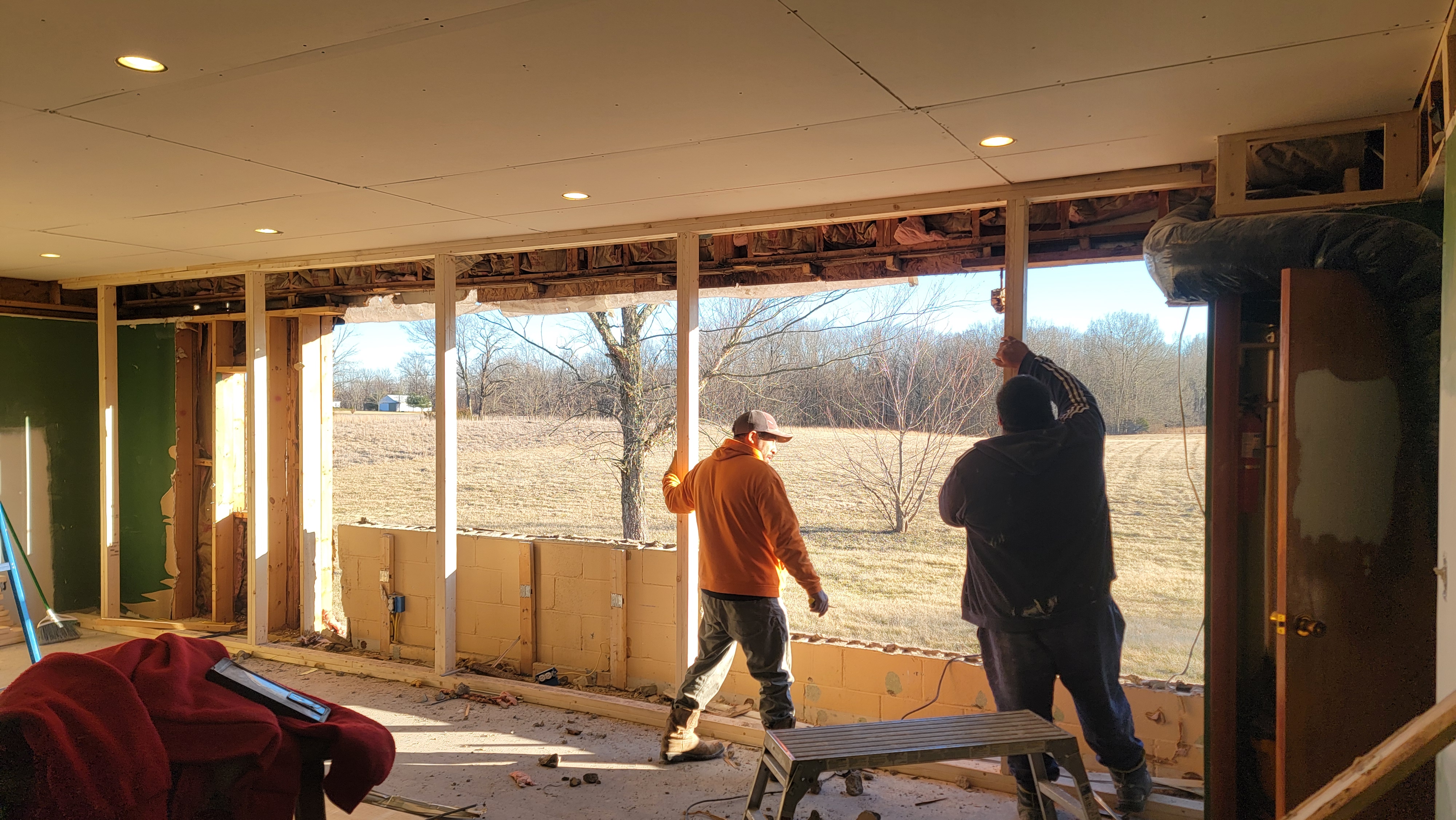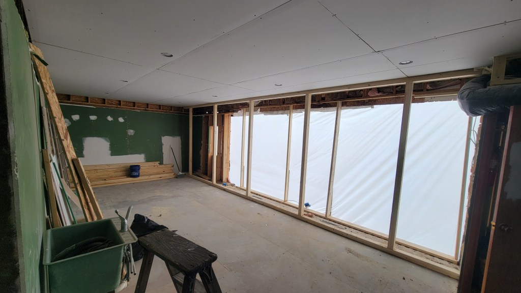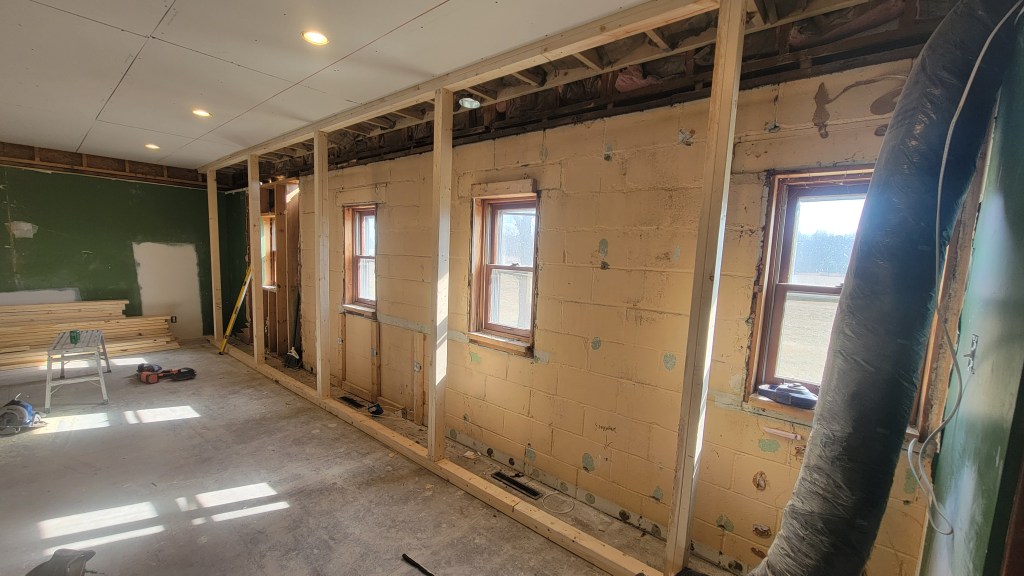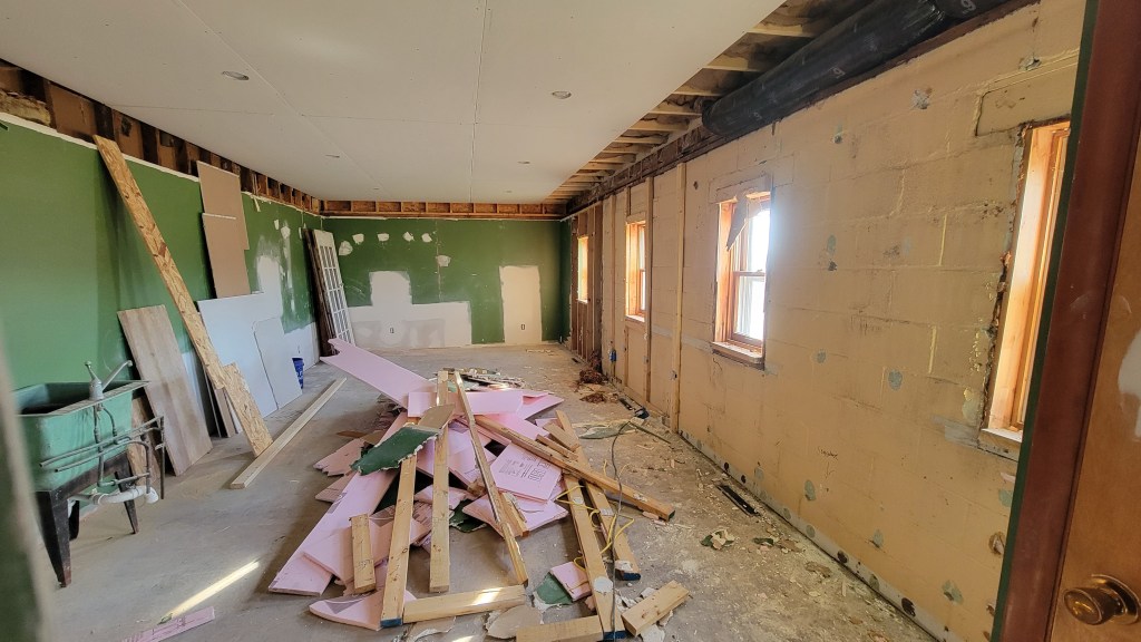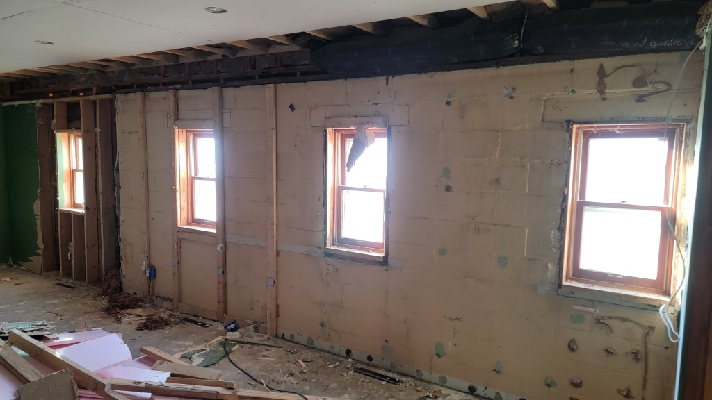 Work started on the Family Room back wall this week. You may or may not remember that we’d discovered the back wall being largely cinderblock (theoretically a previous garage), which complicated things. And, par for the course, it’s going really fast! The crew on the job is super friendly! Great guys. I was thinking that they were going to only be removing part of the cinderblock from that back wall. However, they ended up removing the entire cinderblock portion of the wall. This makes sense to me. Now the wall can be at a more uniform thickness.
