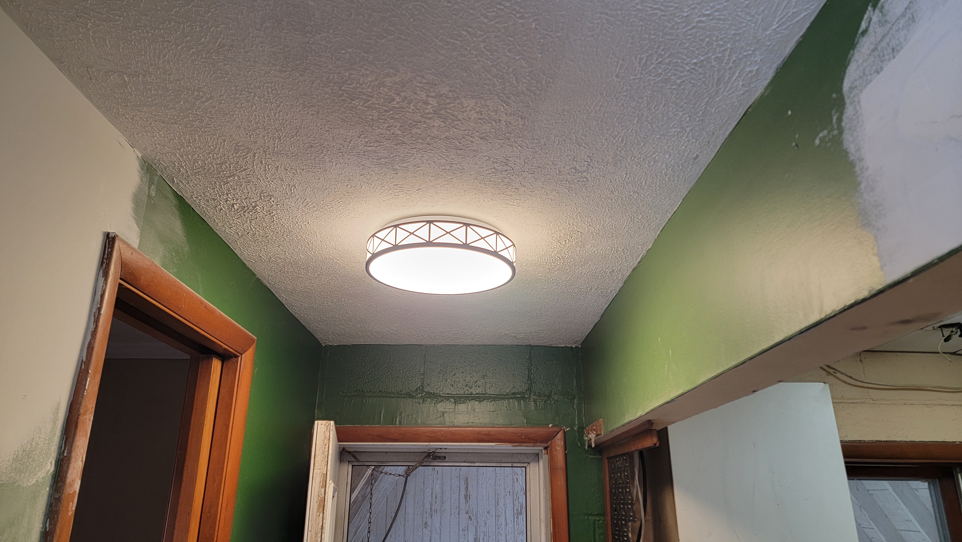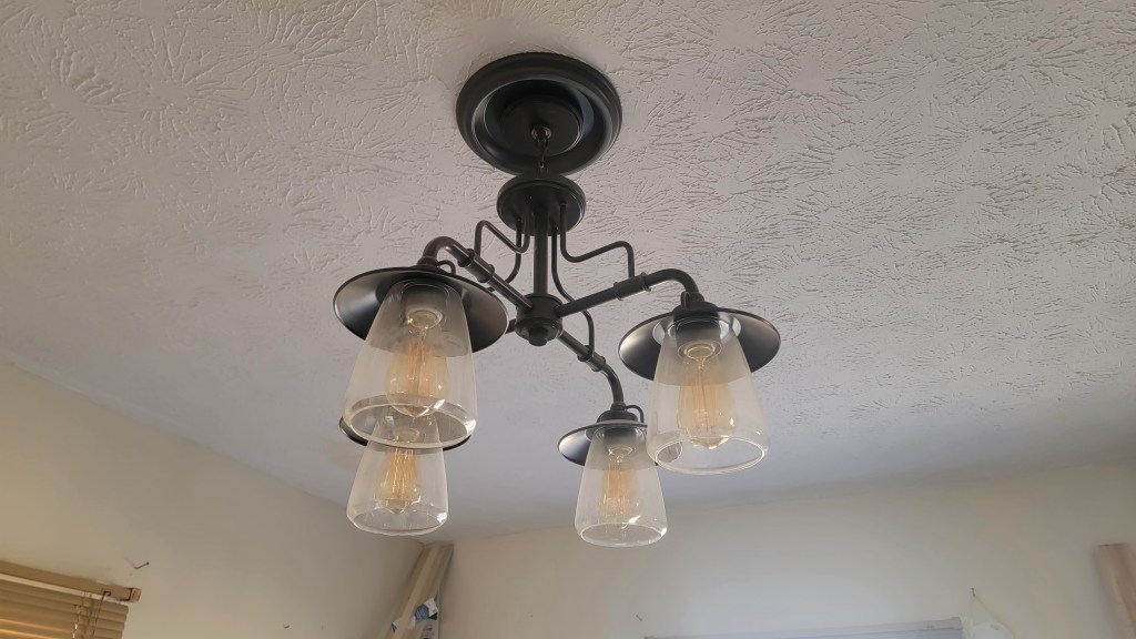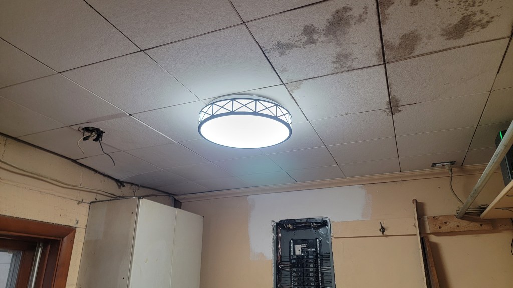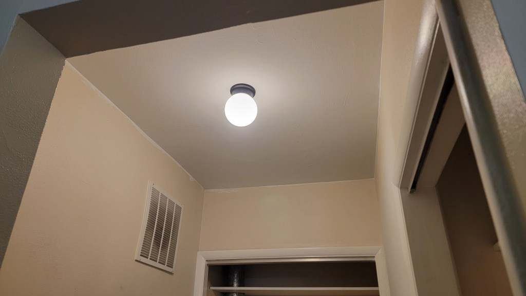More lighting was put up as well. For the dining room light, we had to find a ceiling medallion to cover up a rather large hole in the ceiling. For the entry way from the side door and the laundry room, In installed, for the first time, lights with no replicable light bulbs. Just adapting to new technology, but wondering what happens when the LED’s go out, and when that might be. Hopefully it’ll last long past when we’re gone and it’ll be someone else’s problem. Lights installed in the closets, easy peasy. And lights installed at the front door, which look great!