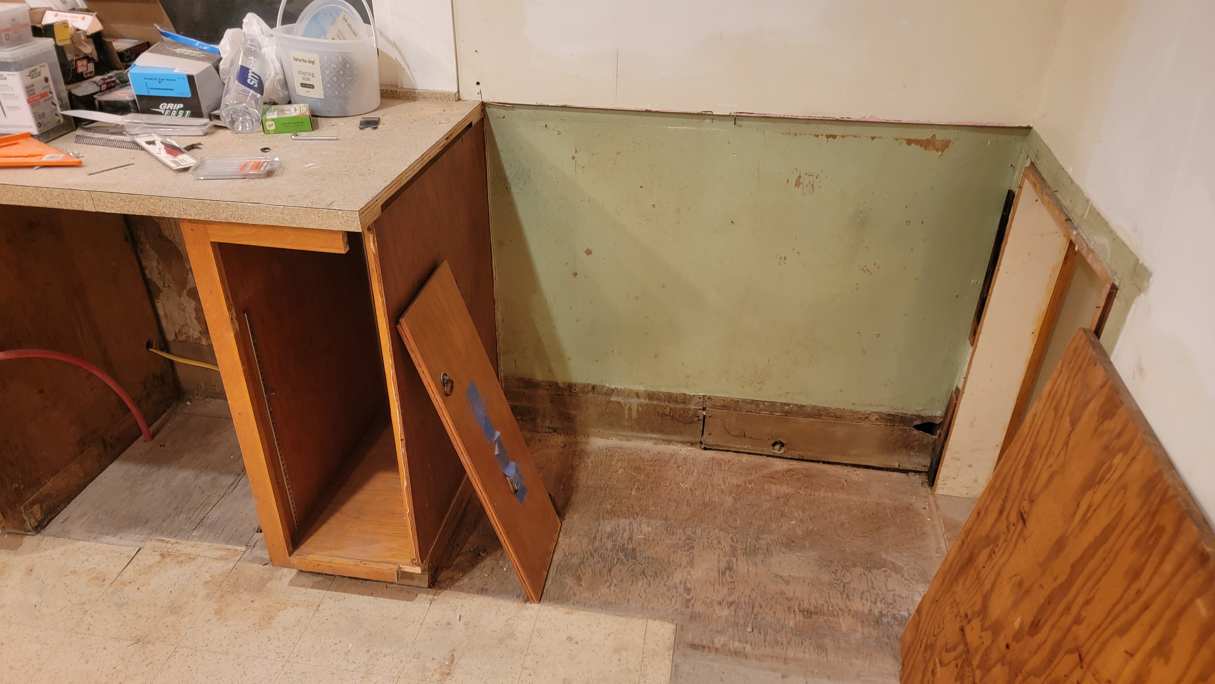 Throughout the week, we just accomplished a number of little jobs that needed to be done. Tuesday night, I prepped the area where the refrigerator is going to go. The countertop needed to be cut and the cabinet needed to be altered. Sonya had the idea that the end cabinet next to the refrigerator could be used for larger pans and sheets. I repurposed a cabinet door and cabinet end that had been taken out, fabricated some trim, installed everything, and it looked… okay? Good enough? We’ll go with “good enough for now”. It’ll look better once its painted.
