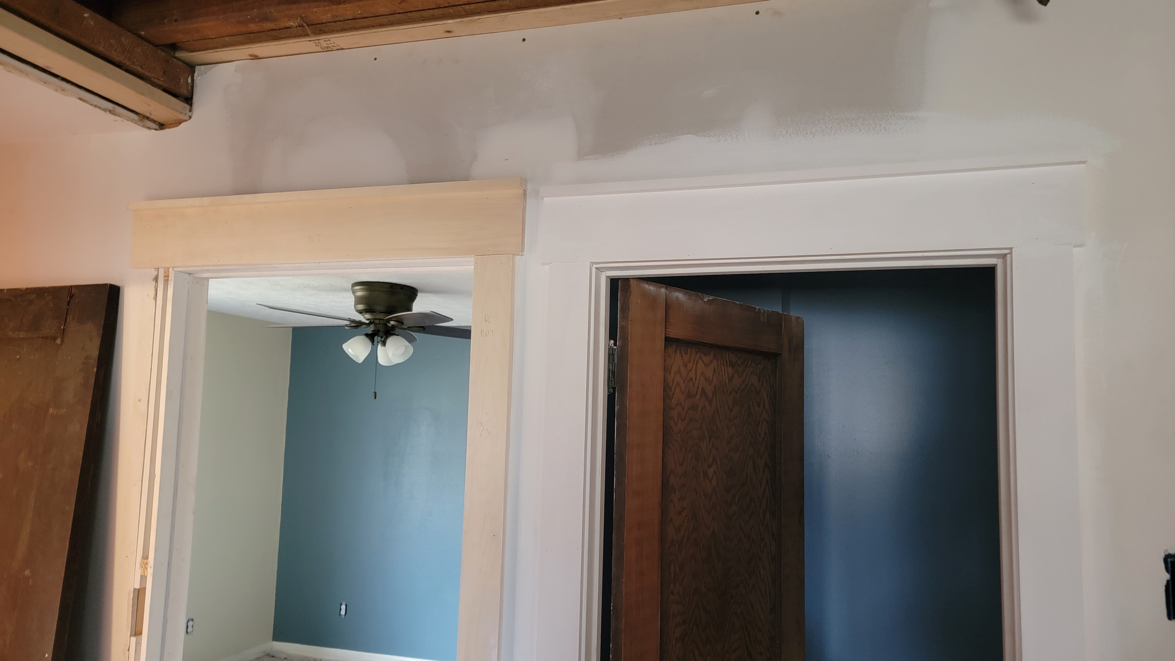As discussed in a previous post, Sonya found some salvaged doors online that we wanted to use in the house somehow. We chose the two best doors to be hung in our bedroom and the 1st floor bathroom since they would be the most visible. So (without any real instructions from us), the crew installed them as-is. Which was fine. But, mostly (we think) because of the floors not being entirely level, the bedroom door on the left was about an entire inch higher than the bathroom door on the right. We were kinda baffled as to why they were installed this way, but we weren’t going to make a stink about it.