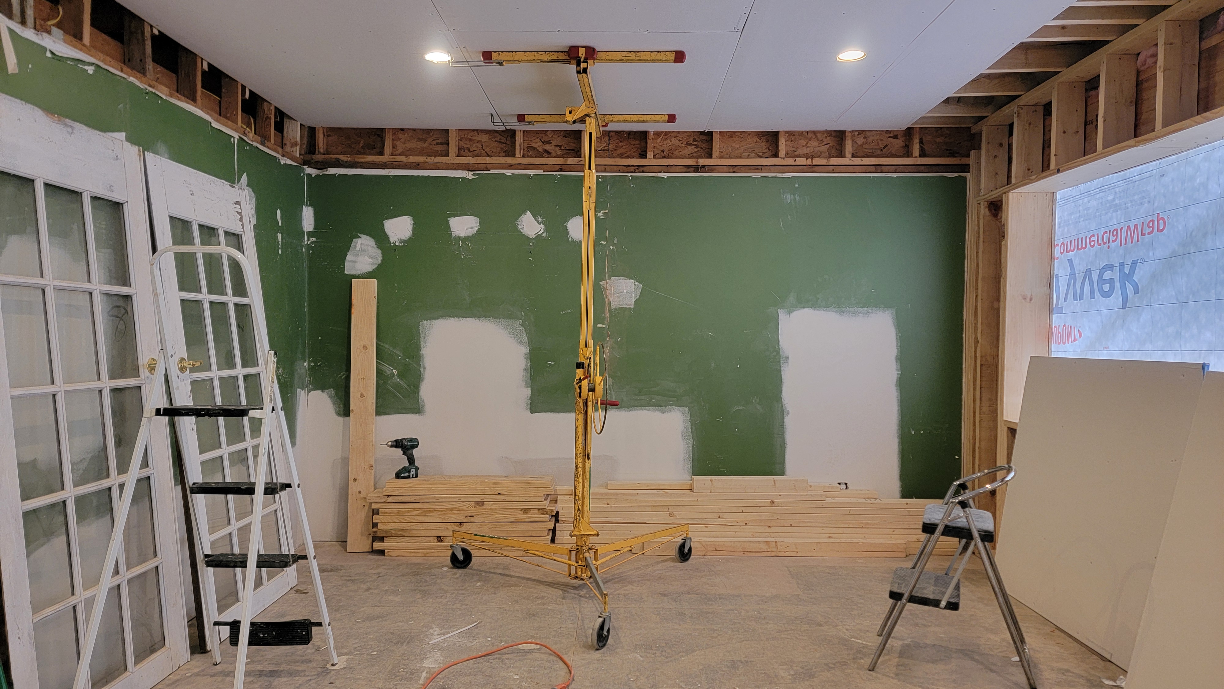 With the help of a rented drywall lift from Menards (which I had just recently discovered existed from investigating “how to hang drywall on the ceiling” on YouTube – something I should have done to begin with), Sonya and I fought with the strength of 10 full-grown men.