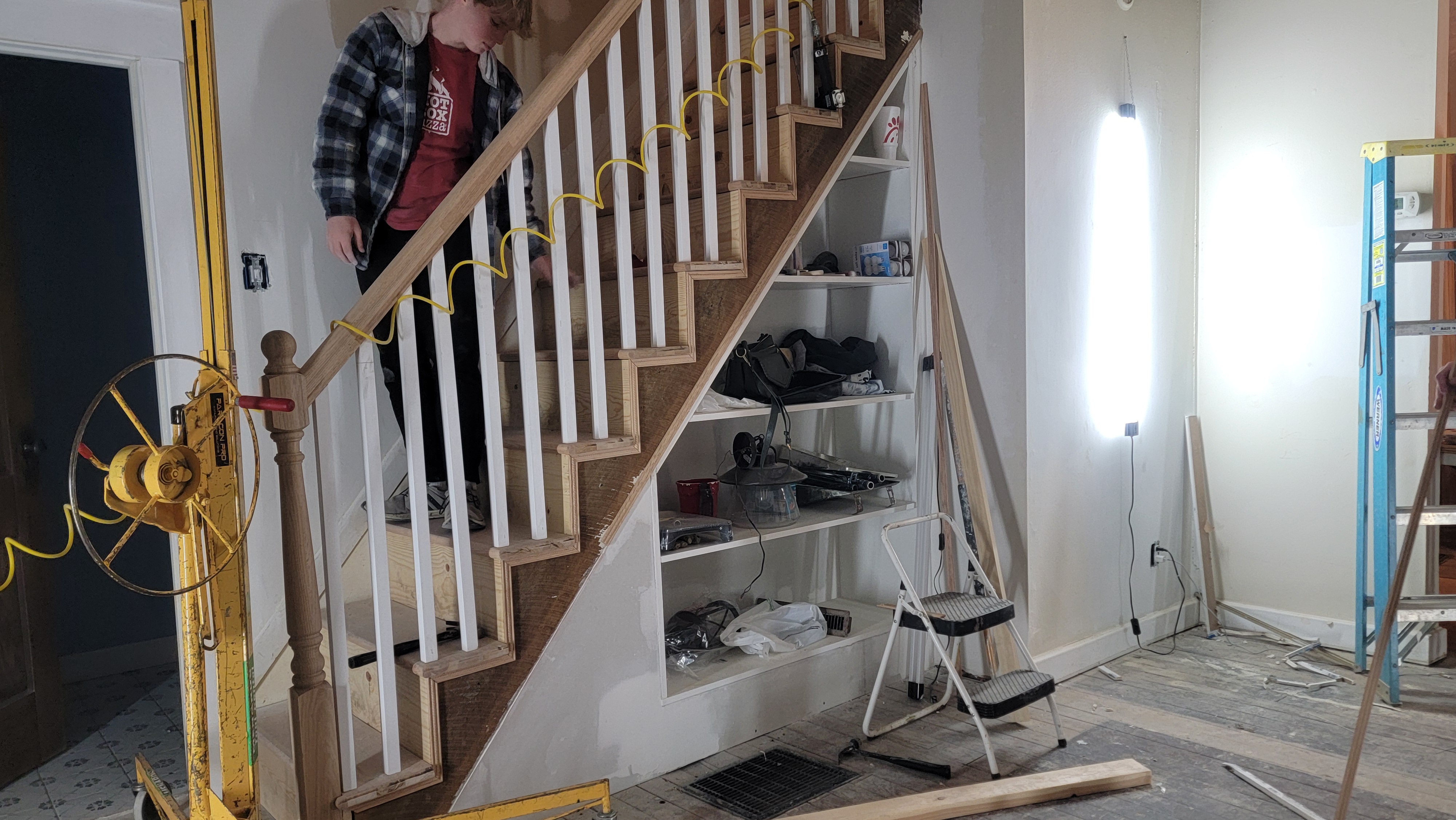 Saturday night, while we hung drywall, Eli worked on installed trim work at the stairs. Turned out really well! And he was able to put that Greenwood High School Geometry to good use!