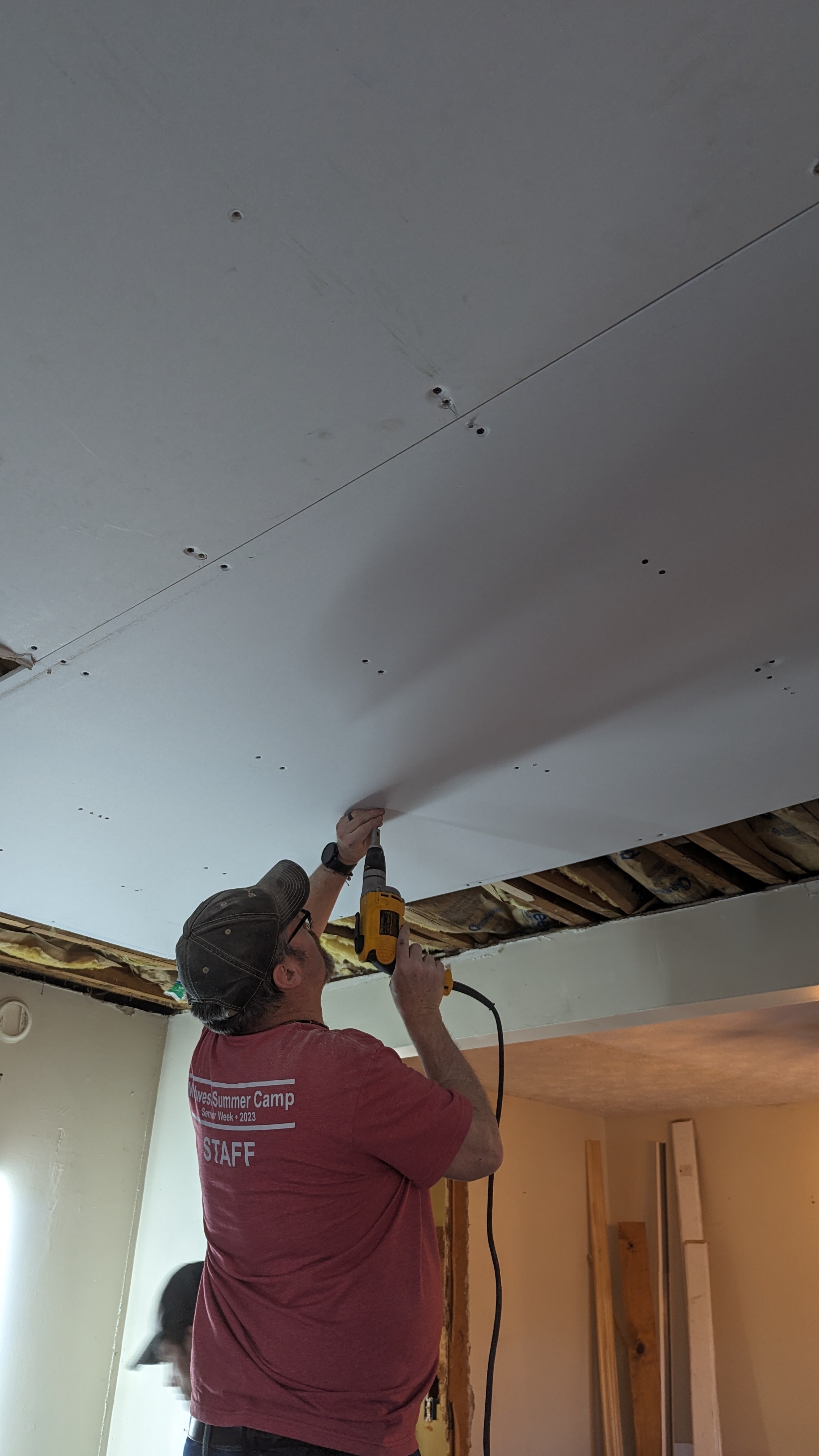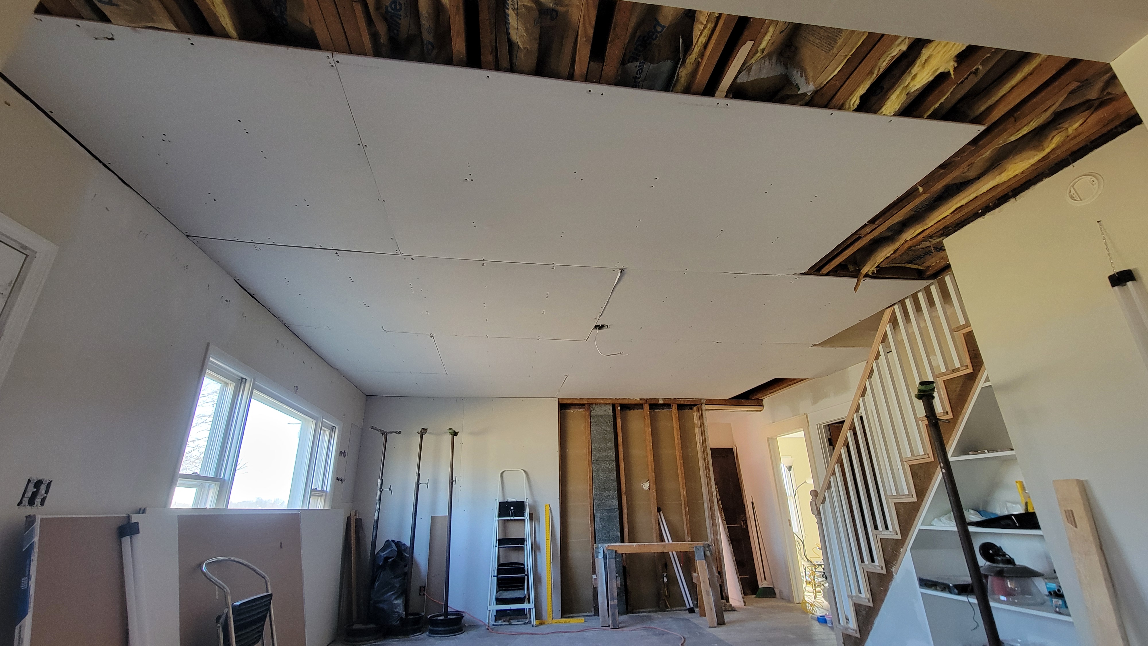 That lift was a game-changer! We started the work at around 11am or so and finished up around 9pm. We got a row of panels in the family room moved, the ceiling finished, two panels in the living room moved, and the ceiling about 85% done. Eli was able to pick up and drop off some more drywall, and was able to help out until we finished, along with Seth after getting off of work. It was a productive day for sure.