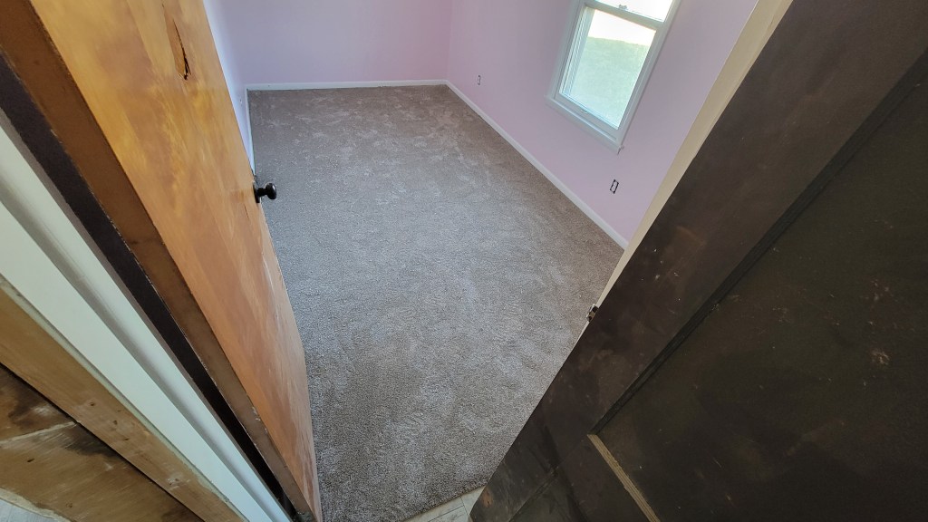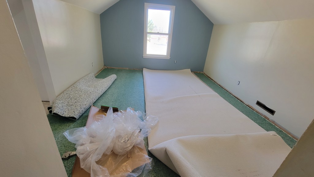 Another big step in this house-to-home transition was the installation of the carpet. You may remember that our original plan was to install hardwood flooring throughout the first floor and vinyl plank flooring throughout the second floor, which exceeded our budget. We ultimately decided to carpet the second floor and the bedrooms, and install engineered hardwood floors through the rest of the first floor. I’m very happy with this decision. I think that having carpet in the bedrooms is going to be a good move.