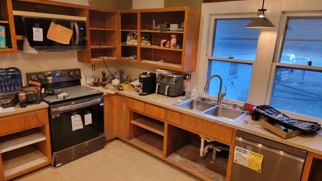 Another milestone in the house-to-home transition was the delivery of the kitchen appliances. I hadn’t quite finished the hookups for the refrigerator and dishwasher by the time that they arrived, so I had them stage them in the living room for the time being. The guys delivering the appliances didn’t seem to mind that too much. After getting the water connections in place, I temporarily put the appliances in place, mostly to get them out of the way of the drywallers, but also to get a sense of how the kitchen was going to look.