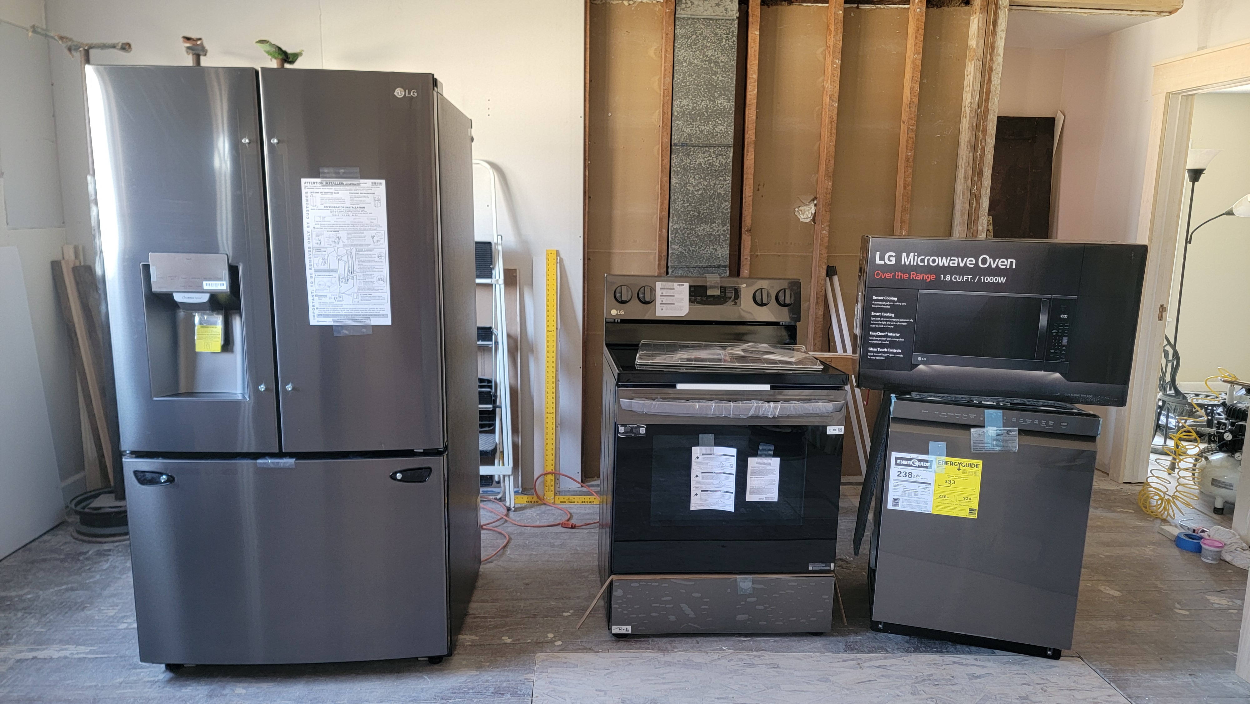 Another milestone in the house-to-home transition was the delivery of the kitchen appliances. I hadn’t quite finished the hookups for the refrigerator and dishwasher by the time that they arrived, so I had them stage them in the living room for the time being. The guys delivering the appliances didn’t seem to mind that too much. After getting the water connections in place, I temporarily put the appliances in place, mostly to get them out of the way of the drywallers, but also to get a sense of how the kitchen was going to look.