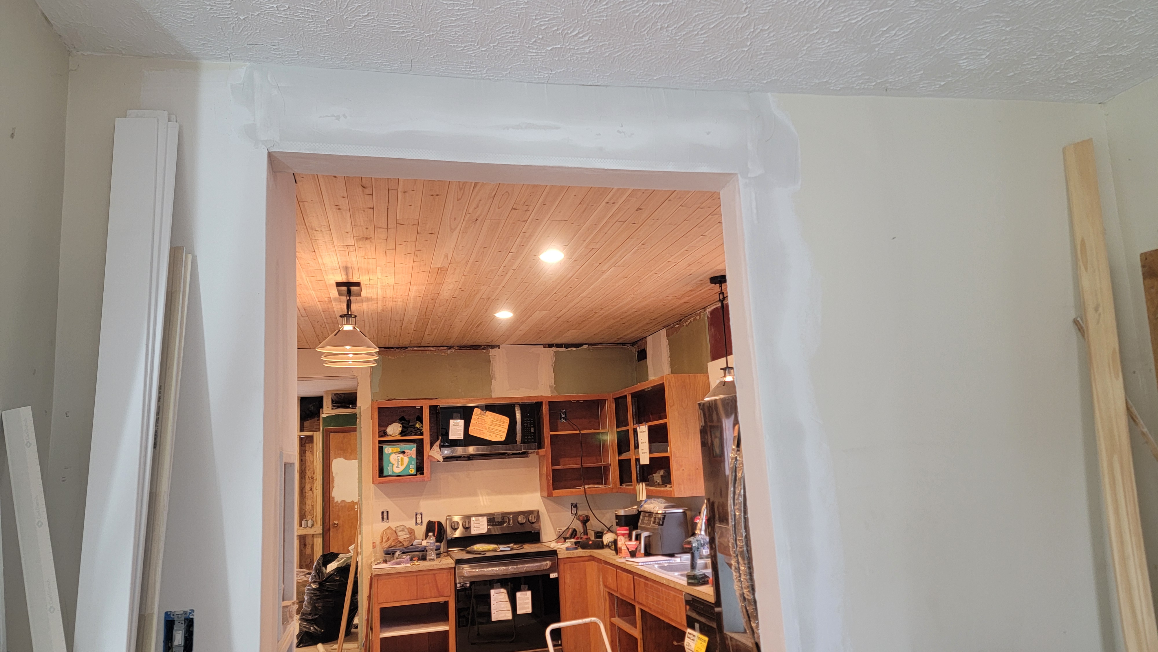They even came in and worked all day Saturday. We worked after they left, hanging the last of the drywall at the top of the walls in the back family room. Eli worked on this while I worked on the drywall on the entry way between the kitchen and family room.