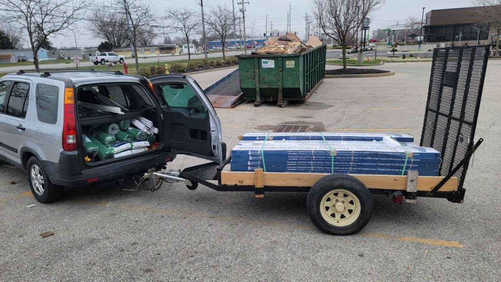 Tuesday, March 5th was a pretty busy day with errands to run, kids to pick up, and picking up the flooring! What was thought to be a “just run by the flooring place and pick up the flooring” turned out not being that simple. Luckily I’d bought this little trailer, which has come in quite handy during this renovation. The pallet was loaded onto the trailer, like a glove, and the rest of the supplies fit into the back of the CR-V. Flooring gets installed in the living room, dining room, and kitchen on March 21.