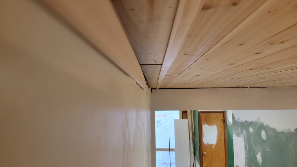 Now, to what was one of my least favorite things to do on this project: crown molding in the kitchen. I’d always heard that cutting crown molding was a difficult thing to wrap your head around, and that it was the most difficult part of installing it. That was certainly true that it’s tough at first to visualize how it’s going to be installed and cutting the angles correctly. But the most difficult thing about installing it was installing it into a 100-year old house with wall studs and floor joists that were pretty uneven at this point. Eli and I did the best that we could as amateurs, but in the end, (insert bold statement here) I’m not sure it could have been done any better by anyone else given the condition of the walls and ceilings. Pro stock tip: invest in companies that produce caulk, because we’re about to be using a lot of it!