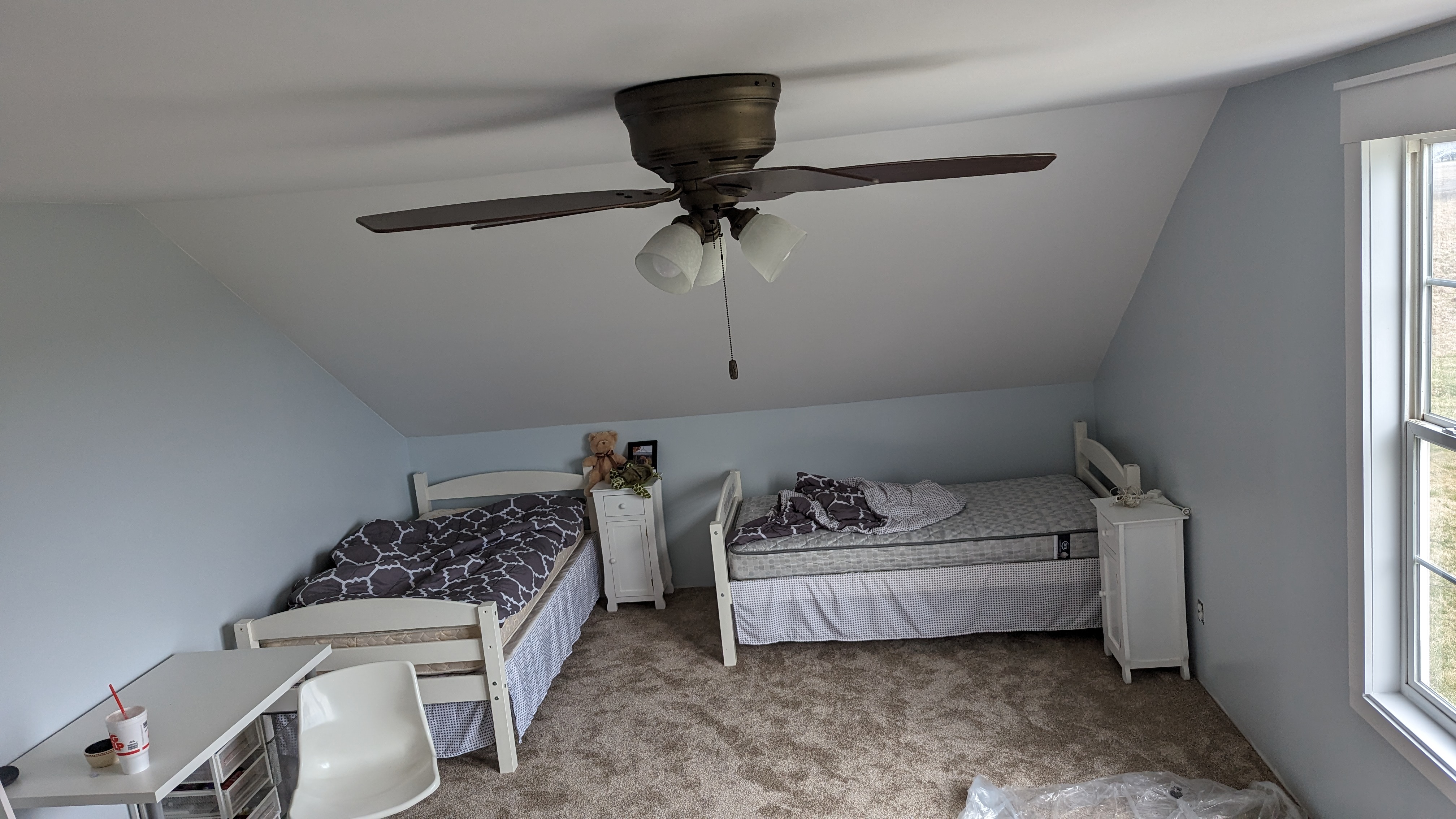 With the carpets down, the bedrooms are pretty much done, with the exception of installing some baseboards here and there. Last Saturday, the kids were anxious to move in. So, they started pulling their stuff out of the detached garage and started setting up their rooms the way they wanted them.