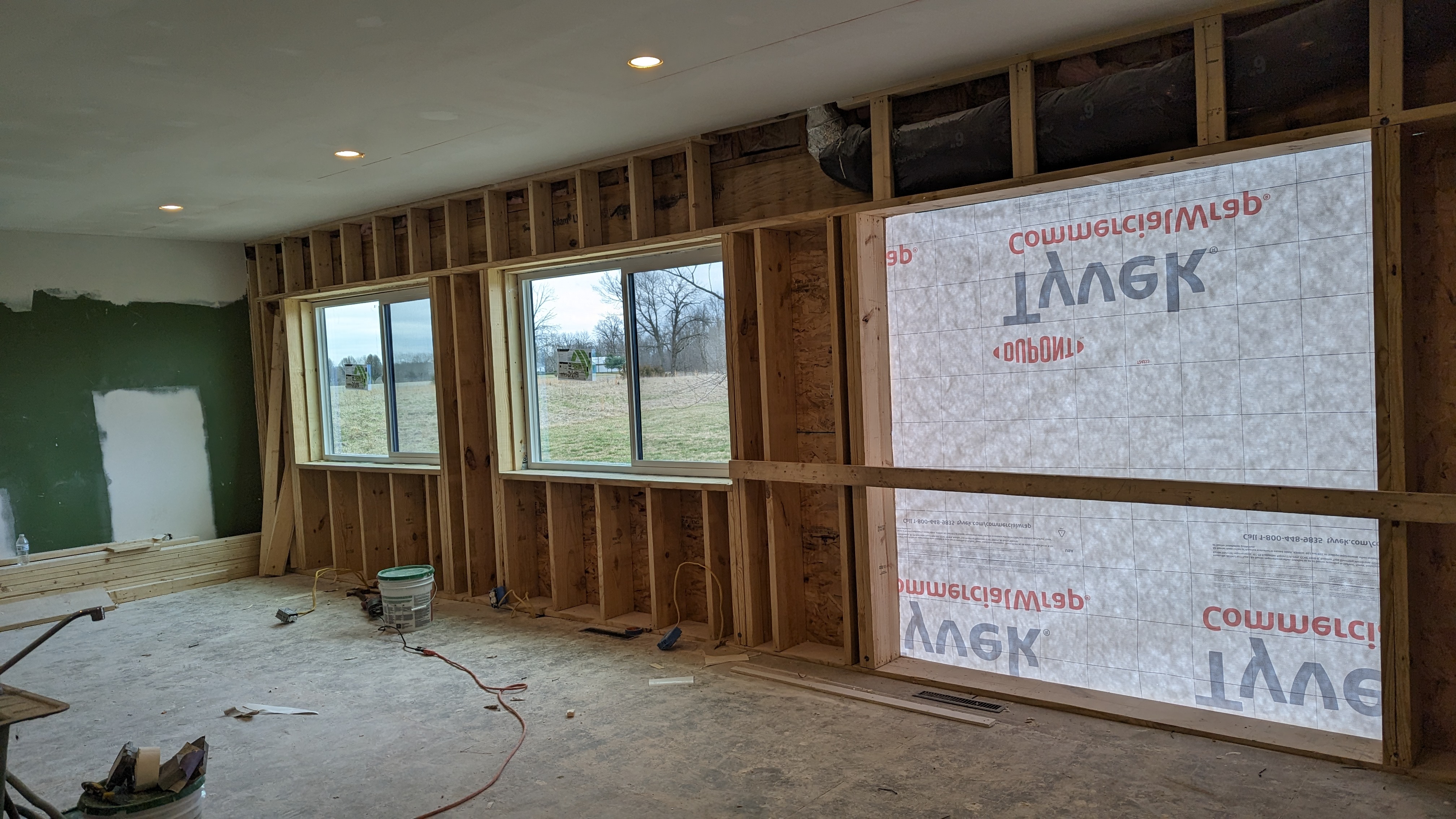 Lots of progress on the back wall! We got a surprise call from our GC telling us that the windows had come in about a week earlier than they were expecting. So the crew came back the next day to get a plan together for installing them, along with the French doors. Since the weather was nice that day, they ended up installing them right then and there. They got to a point that evening where it was weather-tight and good enough to leave overnight. The next day they came back to finish up.