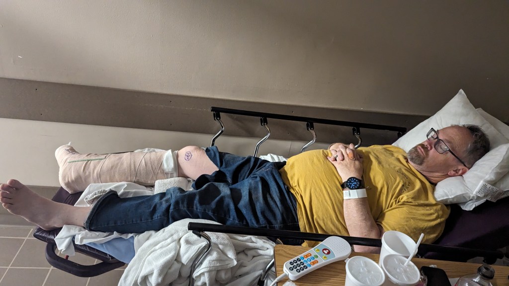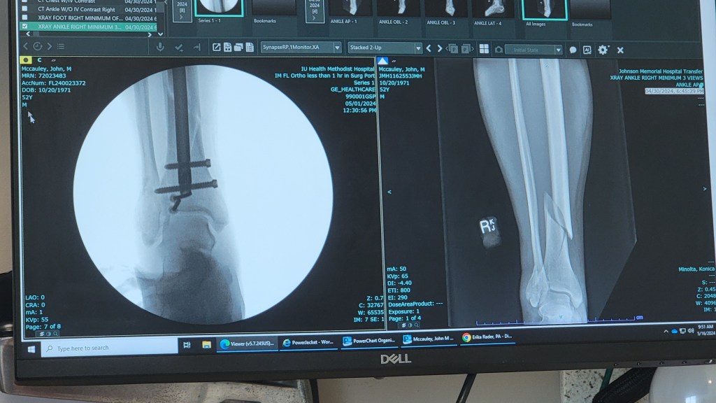 Then came the motorcycle accident. On April 30th, I was going to watch one of Meagan’s last track meets. The weather was really nice and I’d decided to leave a little early and take the motorcycle on some back roads that I’d recently discovered on the way up to Plainfield. I wasn’t 5 minutes from the house, headed south off of IN-44 on Peavine Road, when I went a little too sharply into a curve to the right. The shadows being cast onto the road at that time of day hid some gravel on the road. My back tire hit the gravel, the bike went out from under me, and the bike slammed down onto my right leg. My tibia sustained a spiral fracture, and my fibula was fractured along with some bones in my ankle. Off to the ER at Johnson County Memorial in Franklin and then eventually to IU Health / Methodist Hospital in downtown Indianapolis for surgery. The recovery time includes 4-6 weeks off of the leg and about a 6-12 month full recovery time. The recovery is about 4 weeks in at this point and so far going well, but you can imagine how this effects the renovation progress.